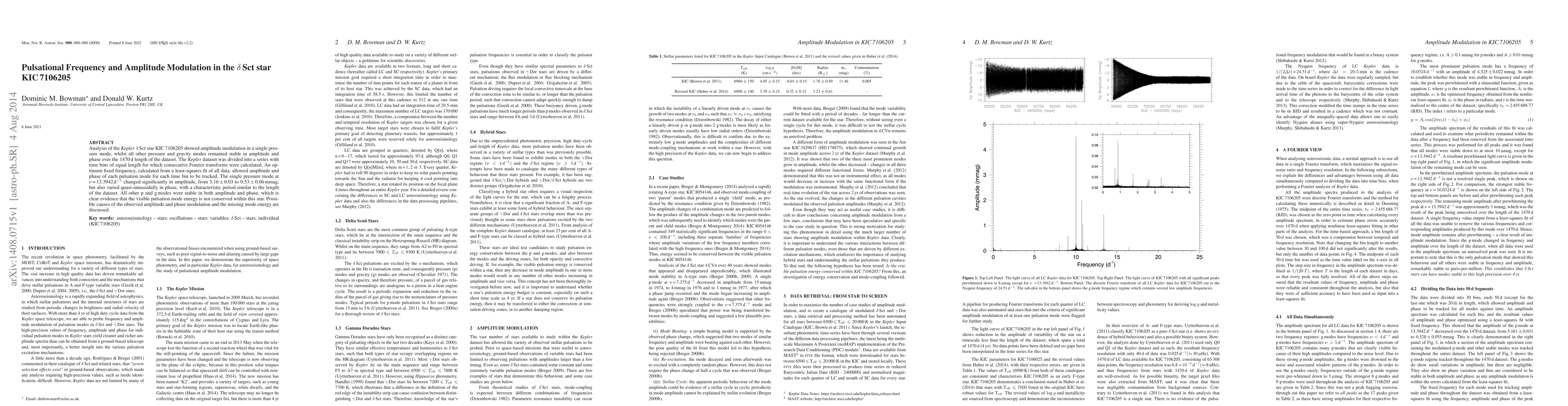 The paper investigates the pulsational behavior of the $\delta$\,Sct star KIC\,7106205 using \textit{Kepler} data, revealing significant amplitude modulation in a single pressure mode while other modes remained stable. The observed modulation suggests non-conservation of visible pulsation mode energy within the star.