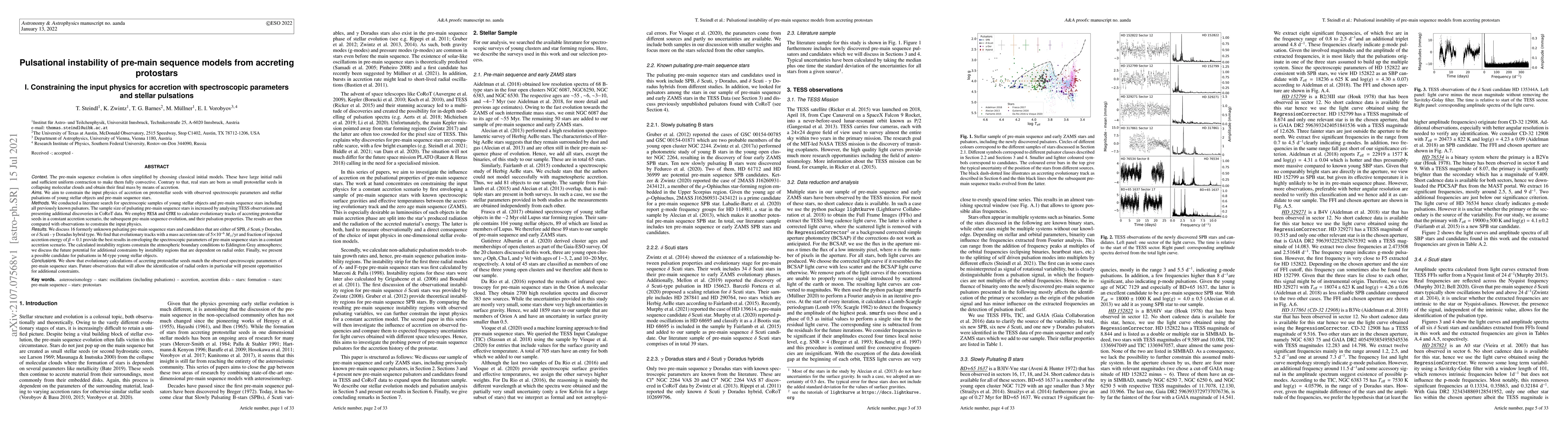 Context: The pre-main sequence evolution is often simplified by choosing classical initial models. These have large initial radii and sufficient uniform contraction to make them fully convective. Contrary to that, real stars are born as small protostellar seeds in collapsing molecular clouds and obtain their final mass by means of accretion. Aims: We aim to constrain the input physics of accretion on protostellar seeds with observed spectroscopic parameters and stellar pulsations of young stellar objects and pre-main sequence stars. Methods: We conducted a literature search for spectroscopic samples of young stellar objects and pre-main sequence stars including all previously known pulsators. The sample size of pulsating pre-main sequence stars is increased by analysing TESS observations and presenting discoveries in CoRoT data. We employ MESA and GYRE to calculate evolutionary tracks of accreting protostellar seeds in a constant accretion scenario, the subsequent pre-main sequence evolution, and their pulsation properties. The results are then compared with observations to constrain the input physics. Results: We discuss 16 formerly unknown pulsating pre-main sequence stars and candidates that are either of SPB, $\delta$ Scuti,$\gamma$ Doradus or $\delta$ Scuti - $\gamma$ Doradus hybrid type. We find that evolutionary tracks with a mass accretion rate of $5\times10^{-6} M_\odot/{\rm yr}$ and fraction of injected accretion energy of $\beta=0.1$ provide the best results in enveloping the spectroscopic parameters of pre-main sequence stars in a constant accretion scenario. The calculated instability regions constrain the atmospheric boundary conditions to Eddington Gray atmospheres; we discuss the future potential for additional constraints by instability regions that are dependent on radial order. We present a possible candidate for pulsations in M-type young stellar objects.
