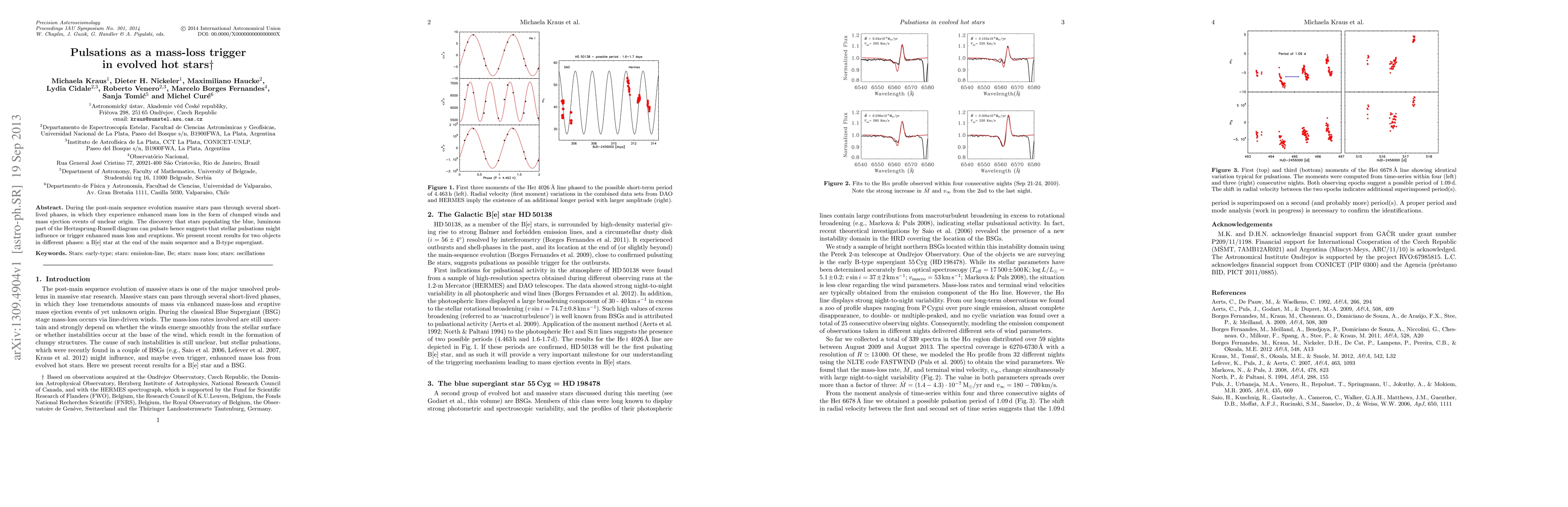 During the post-main sequence evolution massive stars pass through several short-lived phases, in which they experience enhanced mass loss in the form of clumped winds and mass ejection events of unclear origin. The discovery that stars populating the blue, luminous part of the Hertzsprung-Russell diagram can pulsate hence suggests that stellar pulsations might influence or trigger enhanced mass loss and eruptions. We present recent results for two objects in different phases: a B[e] star at the end of the main sequence and a B-type supergiant.