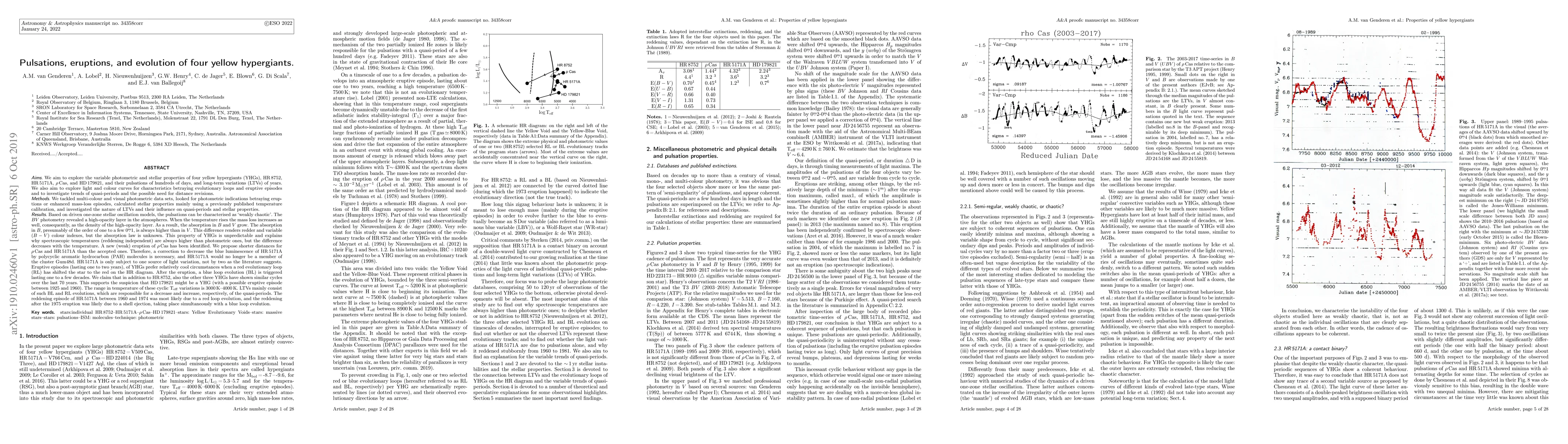 This study investigates the variable photometric and stellar properties of four yellow hypergiants, revealing high-opacity atmospheric layers and significant mass-loss episodes. The research suggests shorter distances for two stars and identifies eruptive episodes linked to red evolutionary loops, followed by blue loop evolutions.