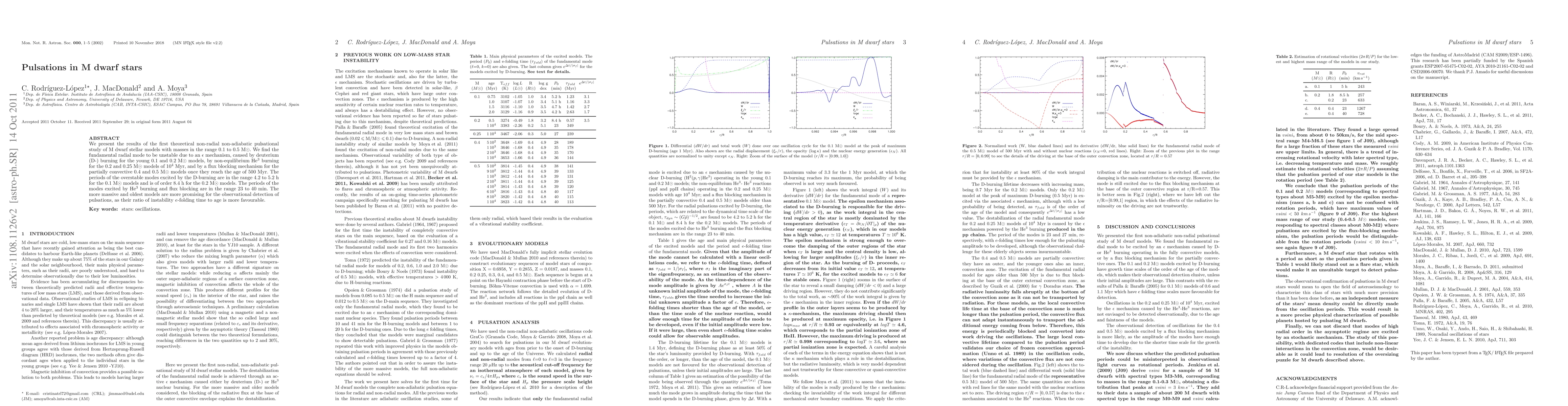 We present the results of the first theoretical non-radial non-adiabatic pulsational study of M dwarf stellar models with masses in the range 0.1 to 0.5M_solar. We find the fundamental radial mode to be unstable due to an \epsilon mechanism caused by deuterium (D-) burning for the young 0.1 and 0.2M_solar models, by non-equilibrium He^3 burning for the 0.2 and 0.25M_solar models of 10^4Myr, and by a flux blocking mechanism for the partially convective 0.4 and 0.5M_solar models once they reach the age of 500Myr. The periods of the overstable modes excited by the D-burning are in the range 4.2 to 5.2h for the 0.1M_solar models and is of order 8.4h for the 0.2M_solar models. The periods of the modes excited by He^3 burning and flux blocking are in the range 23 to 40min. The more massive and oldest models are more promising for the observational detection of pulsations, as their ratio of instability e-folding time to age is more favourable.