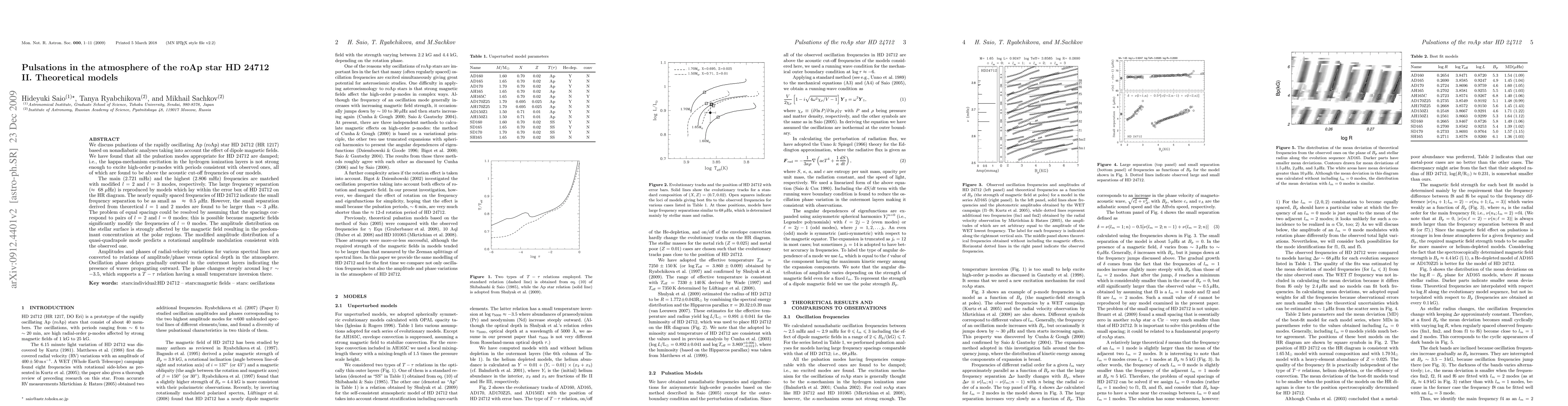 We discuss pulsations of the rapidly oscillating Ap (roAp) star HD 24712 (HR 1217) based on nonadiabatic analyses taking into account the effect of dipole magnetic fields. We have found that all the pulsation modes appropriate for HD 24712 are damped; i.e., the kappa-mechanism excitation in the hydrogen ionization layers is not strong enough to excite high-order p-modes with periods consistent with observed ones, all of which are found to be above the acoustic cut-off frequencies of our models. The main (2.721 mHz) and the highest (2.806 mHz) frequencies are matched with modified $l=2$ and $l=3$ modes, respectively. The large frequency separation ($\approx 68 \mu$Hz) is reproduced by models which lay within the error box of HD 24712 on the HR diagram. The nearly equally spaced frequencies of HD 24712 indicate the small frequency separation to be as small as $\approx 0.5\mu$Hz. However, the small separation derived from theoretical $l=1$ and 2 modes are found to be larger than $\sim 3\mu$Hz. The problem of equal spacings could be resolved by assuming that the spacings correspond to pairs of $l=2$ and $l=0$ modes. The amplitude distribution on the stellar surface is strongly affected by the magnetic field resulting in the predominant concentration at the polar regions. Amplitudes and phases of radial-velocity variations for various spectral lines are converted to relations of amplitude/phase versus optical depth in the atmosphere. Oscillation phase delays gradually outward in the outermost layers indicating the presence of waves propagating outward. The phase changes steeply around $\log\tau\sim-3.5$, which supports a $T-\tau$ relation having a small temperature inversion there.