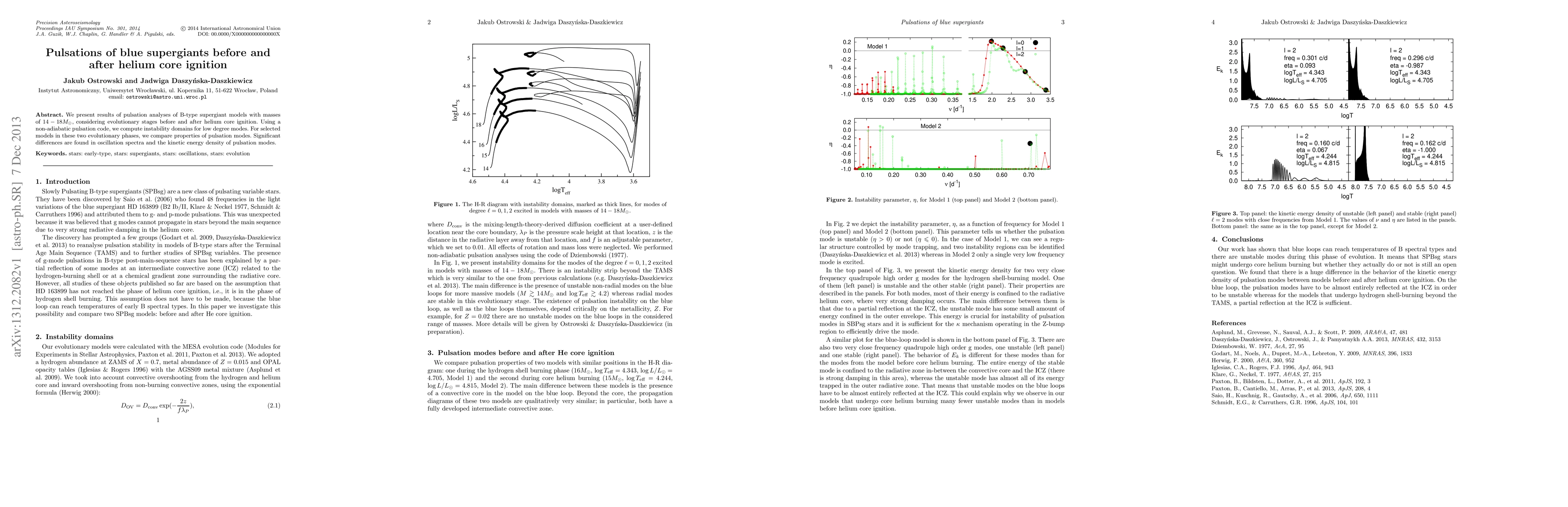 Researchers analyzed pulsations of blue supergiants before and after helium core ignition, finding significant differences in oscillation spectra and kinetic energy density.
