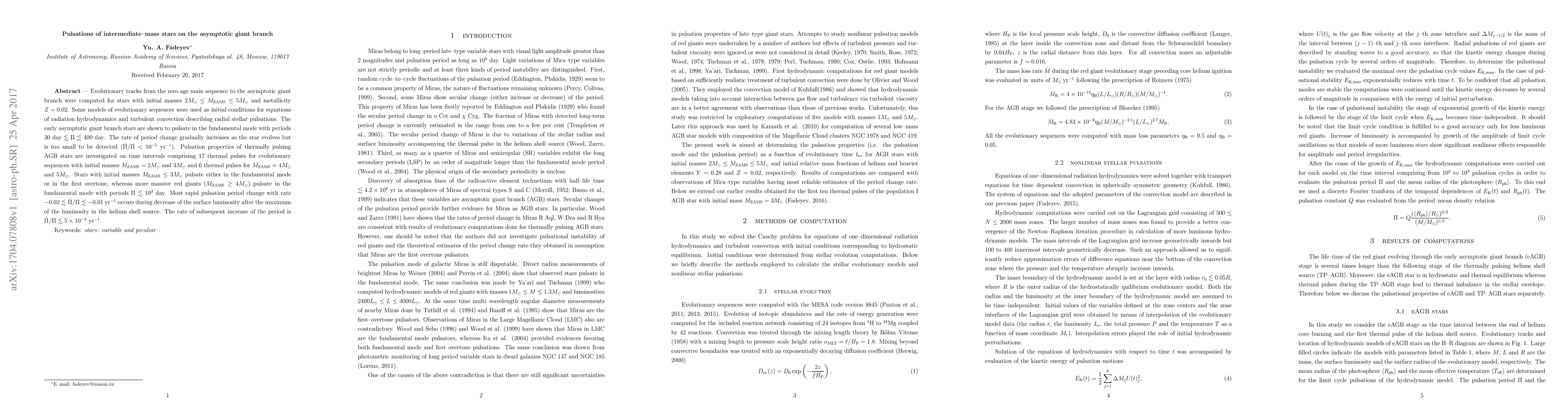This paper investigates the pulsations of intermediate-mass stars on the asymptotic giant branch (AGB), finding that early AGB stars pulsate in the fundamental mode with periods ranging from 30 to 400 days. The rate of period change is minimal and not detectable, while more massive stars pulsate in the fundamental mode with periods up to 1,000 days, showing rapid pulsation period changes during luminosity decreases.
