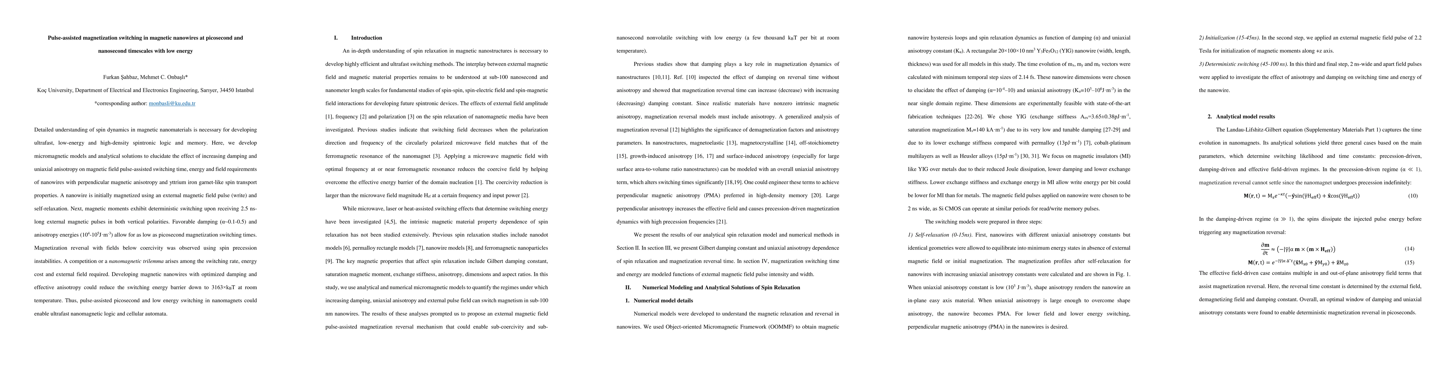 This paper explores the dynamics of magnetization switching in magnetic nanowires using picosecond and nanosecond magnetic field pulses. Optimized damping and anisotropy enable picosecond switching times with low energy, suggesting potential for ultrafast, low-energy spintronic devices.