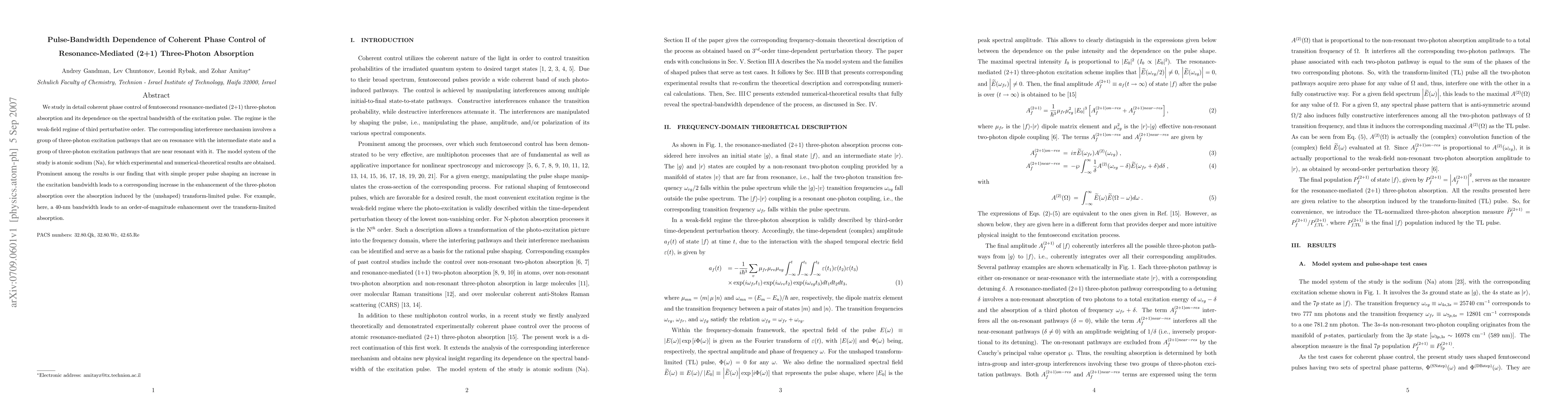 This paper investigates the coherent phase control of resonance-mediated (2+1) three-photon absorption in atomic sodium, focusing on the impact of pulse bandwidth. It finds that increasing the excitation pulse bandwidth significantly enhances three-photon absorption, achieving an order-of-magnitude improvement over transform-limited pulses.