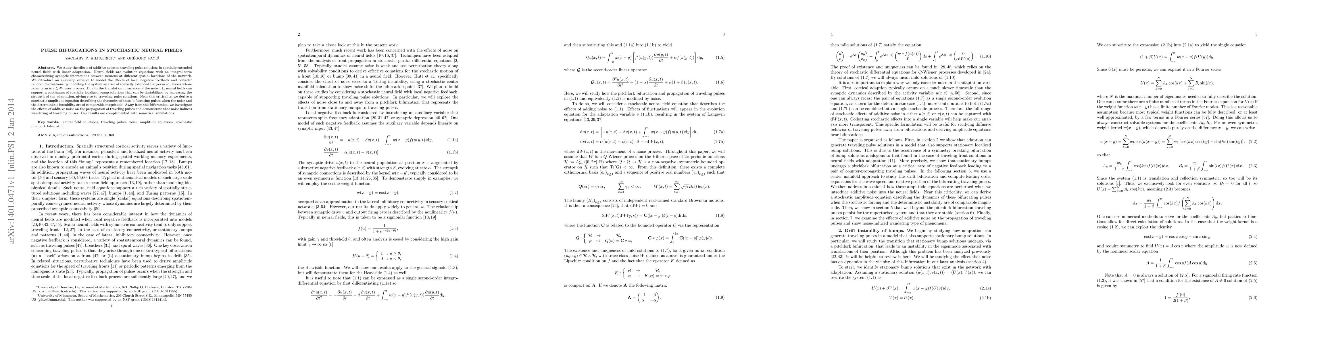 We study the effects of additive noise on traveling pulse solutions in spatially extended neural fields with linear adaptation. Neural fields are evolution equations with an integral term characterizing synaptic interactions between neurons at different spatial locations of the network. We introduce an auxiliary variable to model the effects of local negative feedback and consider random fluctuations by modeling the system as a set of spatially extended Langevin equations whose noise term is a $Q$-Wiener process. Due to the translation invariance of the network, neural fields can support a continuum of spatially localized bump solutions that can be destabilized by increasing the strength of the adaptation, giving rise to traveling pulse solutions. Near this criticality, we derive a stochastic amplitude equation describing the dynamics of these bifurcating pulses when the noise and the deterministic instability are of comparable magnitude. Away from this bifurcation, we investigate the effects of additive noise on the propagation of traveling pulses and demonstrate that noise induces wandering of traveling pulses. Our results are complemented with numerical simulations.