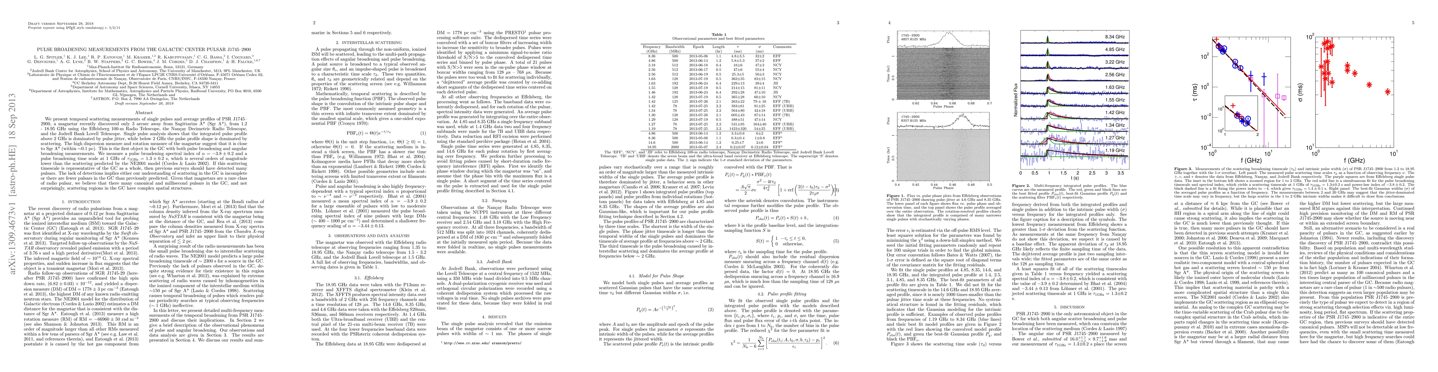 The study measures pulse broadening in PSR J1745--2900, a magnetar near Sagittarius A*, finding a spectral index of -3.8 and a scattering timescale lower than predicted by models, suggesting either incomplete understanding or fewer pulsars in the Galactic Center.