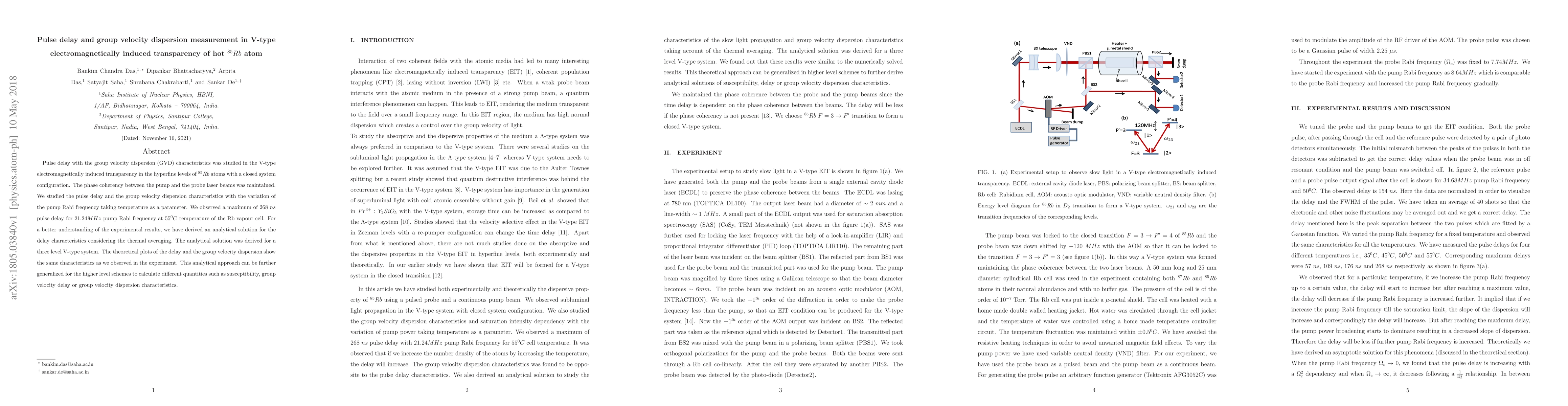 Pulse delay with the group velocity dispersion (GVD) characteristics was studied in the V-type electromagnetically induced transparency in the hyperfine levels of $^{85}Rb$ atoms with a closed system configuration. The phase coherency between the pump and the probe laser beams was maintained. We studied the pulse delay and the group velocity dispersion characteristics with the variation of the pump Rabi frequency taking temperature as a parameter. We observed a maximum of $268$ $ns$ pulse delay for $21.24 MHz$ pump Rabi frequency at $55^0C$ temperature of the Rb vapour cell. For a better understanding of the experimental results, we have derived an analytical solution for the delay characteristics considering the thermal averaging. The analytical solution was derived for a three level V-type system. The theoretical plots of the delay and the group velocity dispersion show the same characteristics as we observed in the experiment. This analytical approach can be further generalized for the higher level schemes to calculate different quantities such as susceptibility, group velocity delay or group velocity dispersion characteristics.