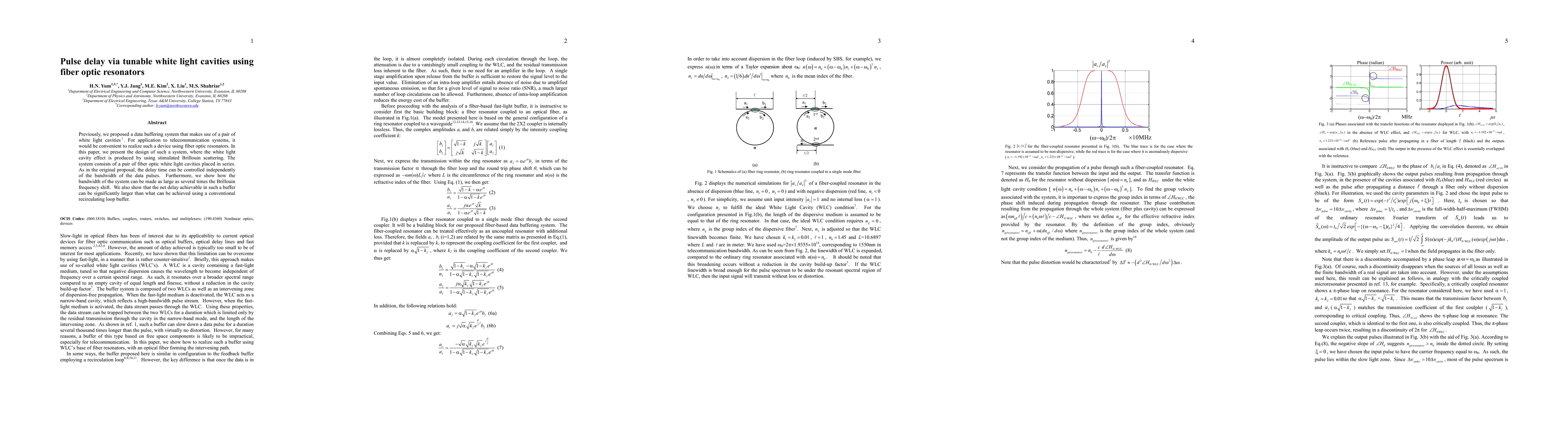 This paper designs a data buffering system using fiber optic resonators and stimulated Brillouin scattering to create tunable white light cavities, achieving significant pulse delay with independent control from bandwidth, and demonstrating a larger delay than conventional recirculating loop buffers.