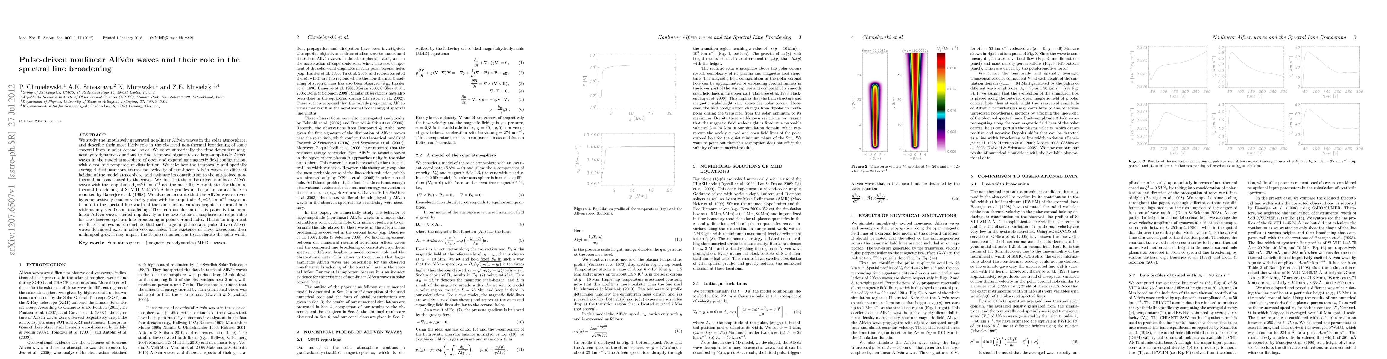 This study numerically investigates impulsively generated nonlinear Alfvén waves in the solar atmosphere and demonstrates their role in non-thermal broadening of spectral lines, specifically the Si VIII line, in polar coronal holes. It concludes that these waves contribute significantly to the observed spectral line broadening, supporting their existence and potential role in solar wind acceleration.