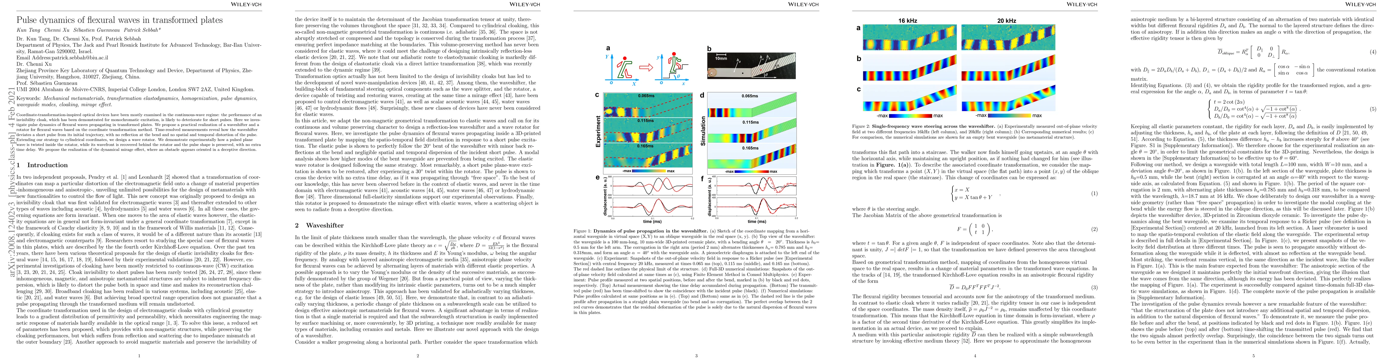 Coordinate-transformation-inspired optical devices have been mostly examined in the continuous-wave regime: the performance of an invisibility cloak, which has been demonstrated for monochromatic excitation, %would inevitably is likely to deteriorate for short pulses. Here we investigate pulse dynamics of flexural waves propagating in transformed plates. We propose a practical realization of a waveshifter and a rotator for flexural waves based on the coordinate transformation method. Time-resolved measurements reveal how the waveshifter deviates a short pulse from its initial trajectory, with no reflection at the bend and no spatial and temporal distortion of the pulse. Extending our strategy to cylindrical coordinates, we design a wave rotator. We demonstrate experimentally how a pulsed plane wave is twisted inside the rotator, while its wavefront is recovered behind the rotator and the pulse shape is preserved, with no extra time delay. We propose the realization of the dynamical mirage effect, where an obstacle appears oriented in a deceptive direction.