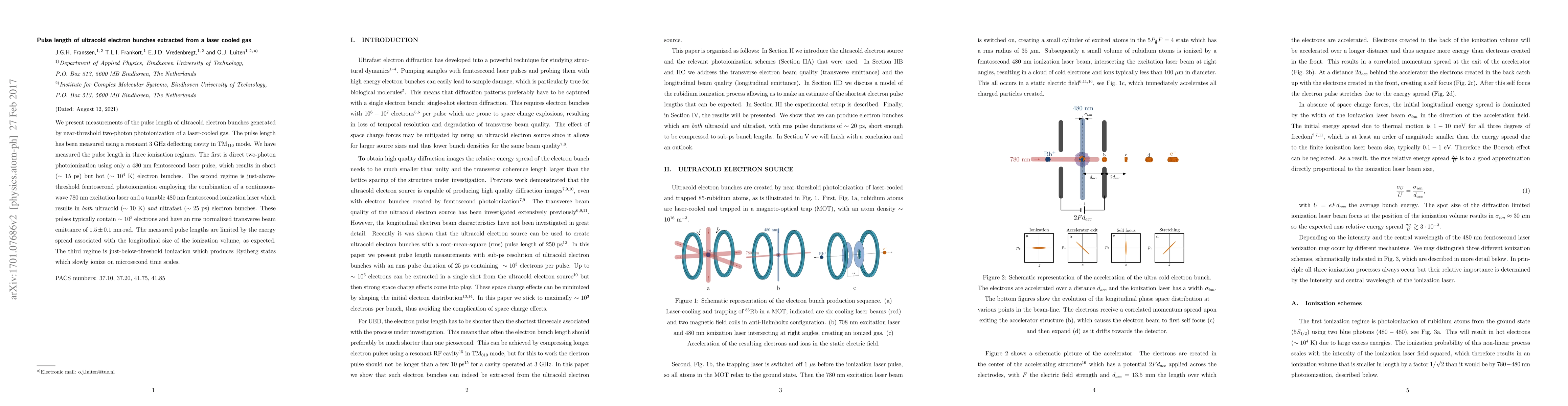 The research utilized a 3 GHz RF deflecting cavity in TM110 mode to measure the pulse length of ultracold electron bunches generated from a laser-cooled gas via near-threshold two-photon photoionization. Simulation parameters and electron trajectories were described in previous references. The electron pulse shapes were calculated by convolving simulation results with the broadband laser spectrum and the emission angle distribution associated with the laser polarization.