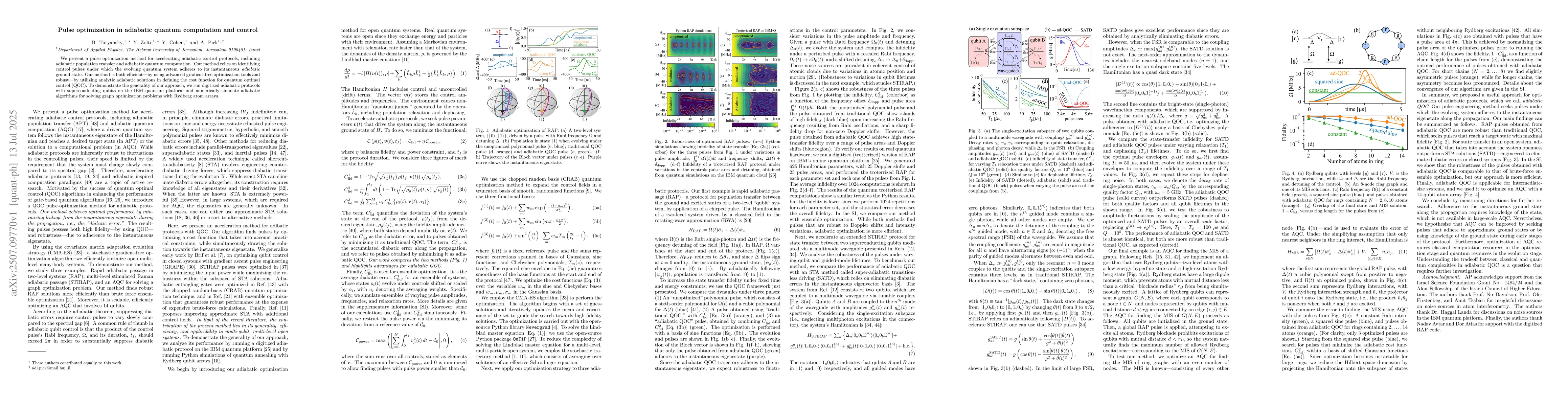 We present a pulse optimization method for accelerating adiabatic control protocols, including adiabatic population transfer and adiabatic quantum computation. Our method relies on identifying control pulses under which the evolving quantum system adheres to its instantaneous ground state. Our method is both efficient -- by using advanced gradient-free optimization tools and robust -- by utilizing analytic adiabatic solutions in defining the cost function for quantum optimal control (QOC). To demonstrate the generality of our approach, we run digitized adiabatic protocols with superconducting qubits on the IBM quantum platform and numerically simulate adiabatic algorithms for solving graph optimization problems with Rydberg atom arrays.