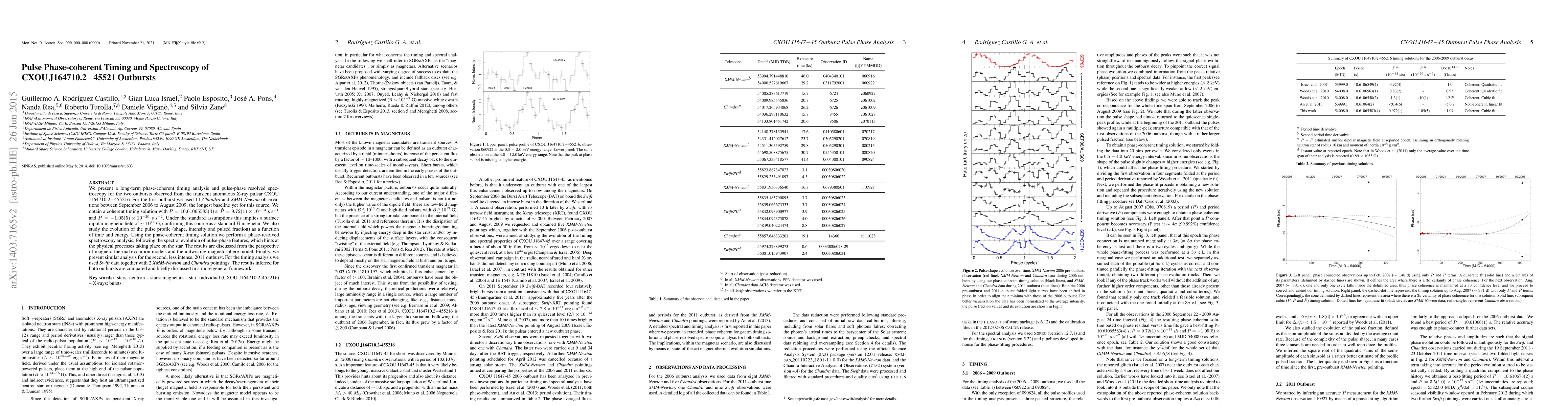 We present a long-term phase-coherent timing analysis and pulse-phase resolved spectroscopy for the two outbursts observed from the transient anomalous X-ray pulsar CXOU J164710.2-45521. For the first outburst we used 11 Chandra and XMM-Newton observations between September 2006 to August 2009, the longest baseline yet for this source. We obtain a coherent timing solution with $P=10.61065583(4)$ s, $\dot{P} = 9.72(1) \times 10^{-13}\;$s s$^{-1}$ and $\ddot{P} = -1.05(5)\times10^{-20}\; $s s$^{-2}$. Under the standard assumptions this implies a surface dipolar magnetic field of $\sim 10^{14}$ G, confirming this source as a standard-$B$ magnetar. We also study the evolution of the pulse profile (shape, intensity and pulsed fraction) as a function of time and energy. Using the phase-coherent timing solution we perform a phase-resolved spectroscopy analysis, following the spectral evolution of pulse-phase features, which hints at the physical processes taking place on the star. The results are discussed from the perspective of magneto-thermal evolution models and the untwisting magnetosphere model. Finally, we present similar analysis for the second, less intense, 2011 outburst. For the timing analysis we used Swift data together with 2 XMM-Newton and Chandra pointings. The results inferred for both outbursts are compared and briefly discussed in a more general framework.