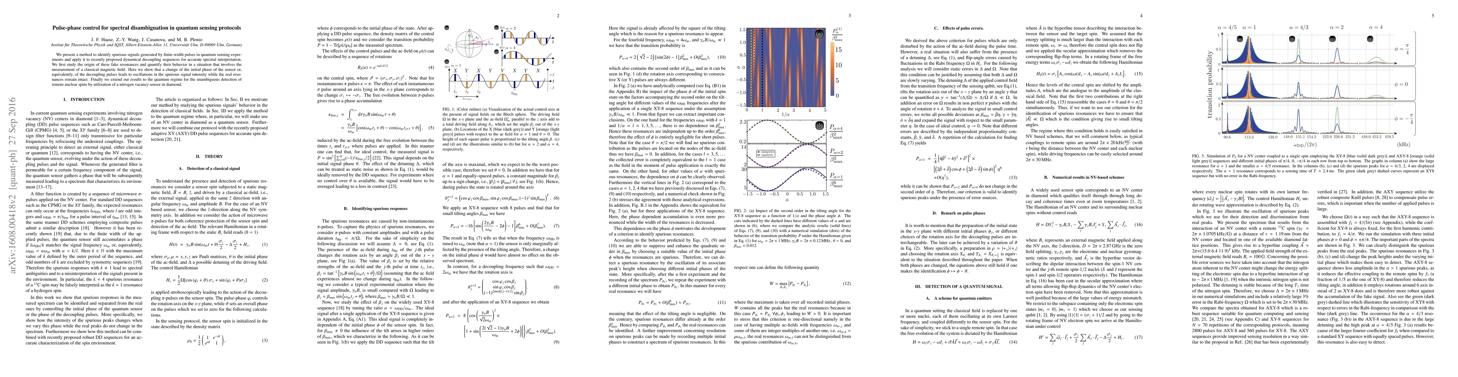 This paper introduces a pulse-phase control technique to identify and mitigate spurious signals from finite-width pulses in quantum sensing, demonstrating its application to dynamical decoupling sequences for accurate spectral interpretation. The method reveals oscillations in spurious signal intensity with phase changes, aiding in the unambiguous detection of remote nuclear spins using a nitrogen vacancy sensor in diamond.