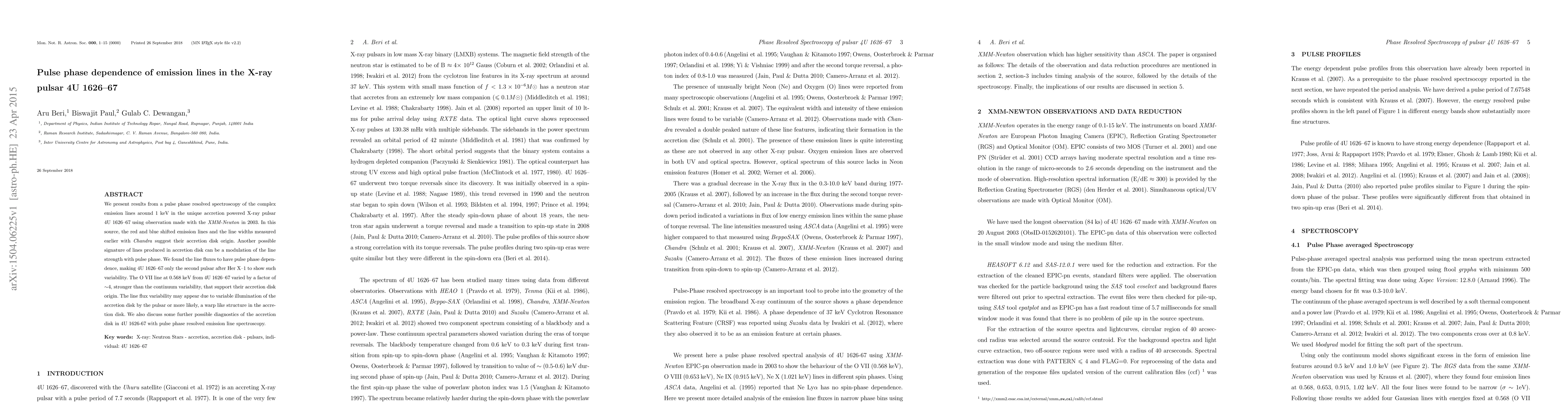 This study reveals pulse phase dependence in the emission lines around 1 keV in the X-ray pulsar 4U 1626-67, indicating variability likely due to a warped accretion disk. The O~VII line flux varies by a factor of $\sim$4, supporting its accretion disk origin.