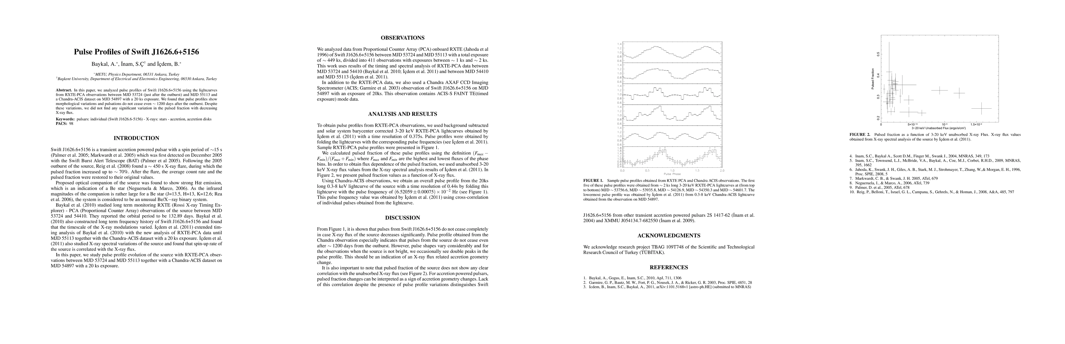 The study analyzed pulse profiles of Swift J1626.6+5156 using RXTE-PCA observations from MJD 53724 to MJD 55113 and a Chandra-ACIS dataset on MJD 54897 with a 20 ks exposure.