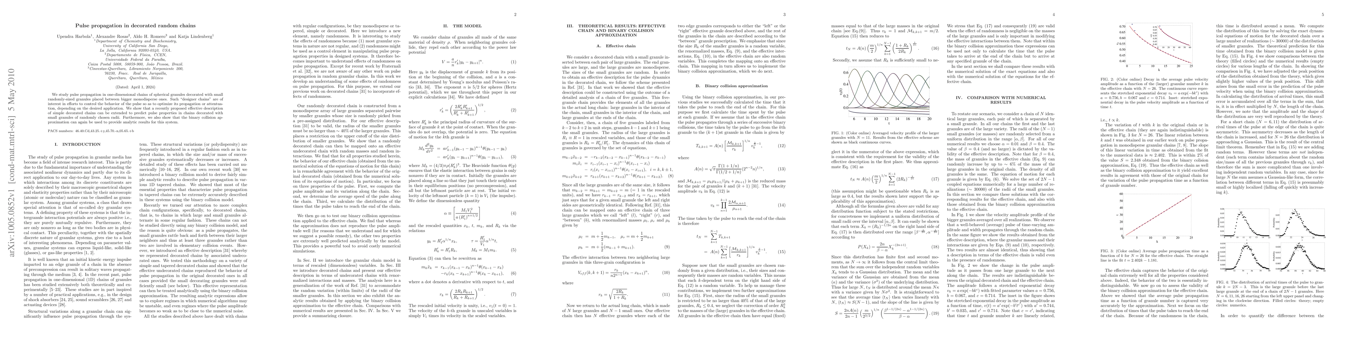 This paper investigates pulse propagation in one-dimensional chains of spherical granules, where some are decorated with randomly-sized granules. The study extends an effective description to predict pulse behavior in these decorated chains and demonstrates that the binary collision approximation can yield analytic results.