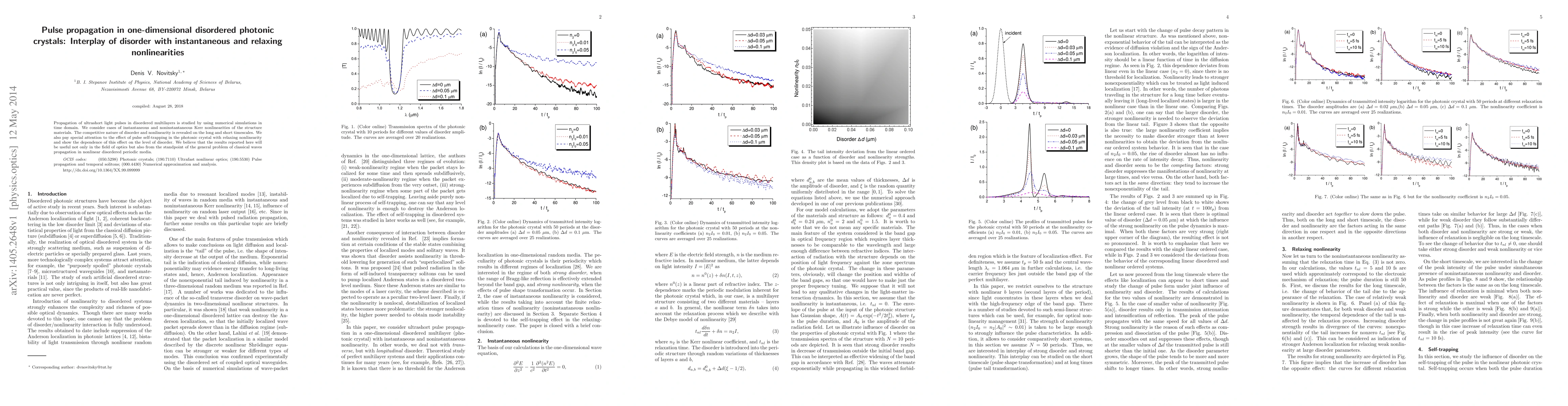 Propagation of ultrashort light pulses in disordered multilayers is studied by using numerical simulations in time domain. We consider cases of instantaneous and noninstantaneous Kerr nonlinearities of the structure materials. The competitive nature of disorder and nonlinearity is revealed on the long and short timescales. We also pay special attention to the effect of pulse self-trapping in the photonic crystal with relaxing nonlinearity and show the dependence of this effect on the level of disorder. We believe that the results reported here will be useful not only in the field of optics but also from the standpoint of the general problem of classical waves propagation in nonlinear disordered periodic media.
