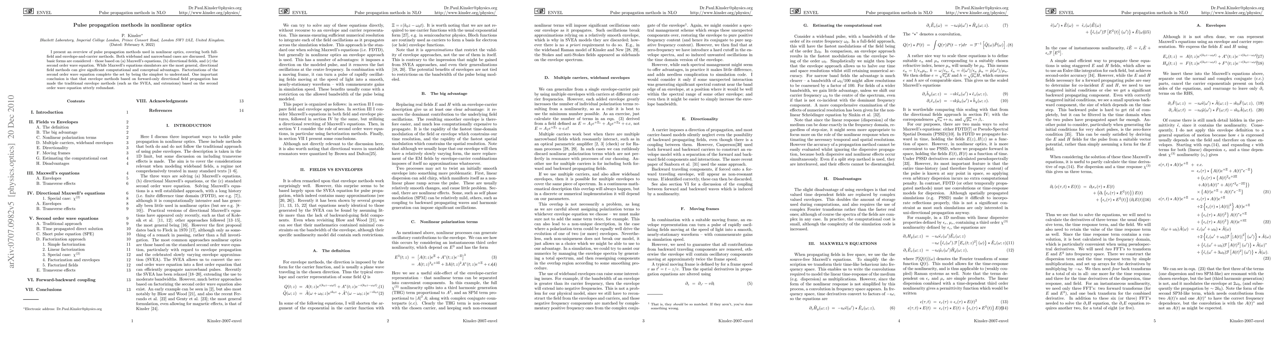 This paper reviews pulse propagation methods in nonlinear optics, comparing full-field and envelope-and-carrier techniques for both wideband and narrowband cases. It discusses three basic forms: Maxwell's equations, directional fields, and second order wave equations, highlighting the computational and conceptual advantages of directional field methods. The conclusion is that forward-only directional field propagation has rendered traditional envelope methods obsolete.