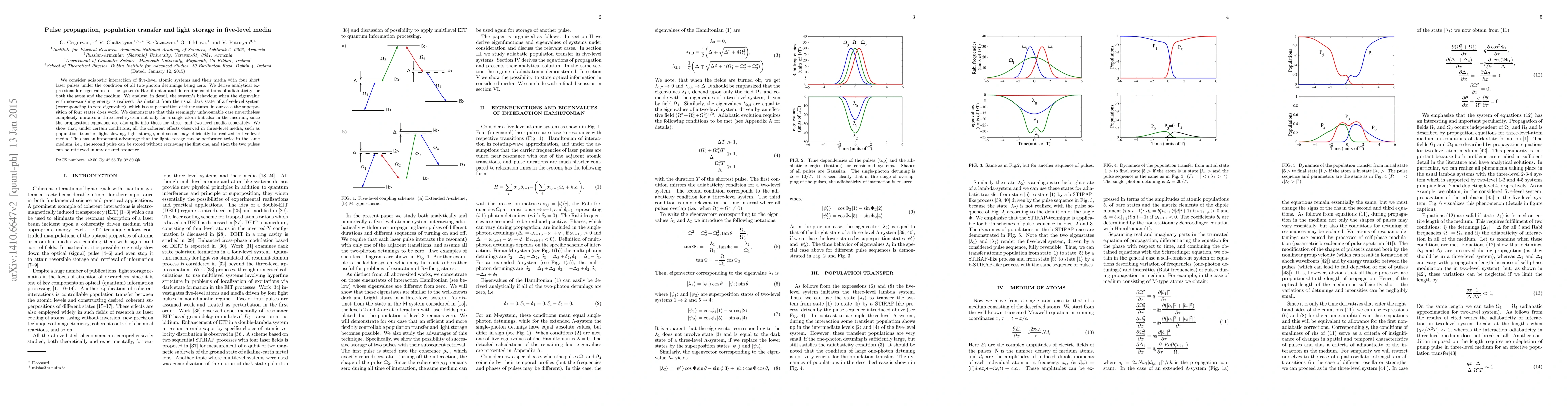 This paper explores the propagation of pulses and population transfer in five-level atomic media under zero two-photon detuning, demonstrating that a four-state superposition can mimic a three-level system. It shows that coherent effects like light storage and population transfer, typically seen in three-level systems, can be efficiently realized in five-level systems, allowing for dual light storage without retrieving the initial pulse.