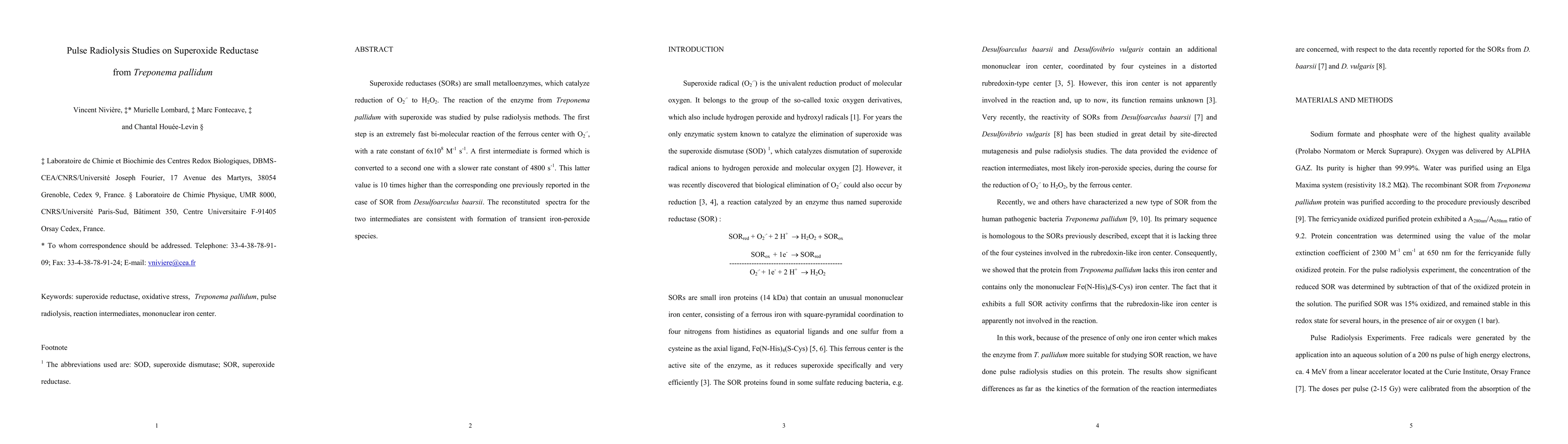 This study uses pulse radiolysis to investigate the reaction mechanism of superoxide reductase from Treponema pallidum with superoxide, revealing a rapid initial bi-molecular reaction and subsequent slower conversion of intermediates, with the latter rate being ten times higher than previously reported for another SOR.
