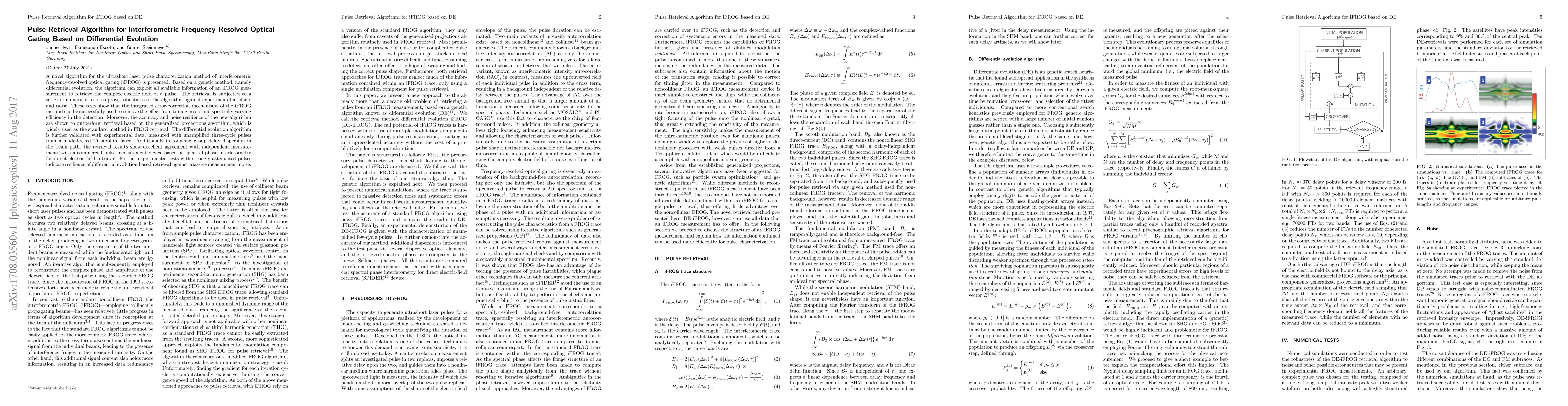 This paper presents a novel differential evolution algorithm for retrieving ultrashort laser pulse characteristics from interferometric frequency-resolved optical gating (iFROG) measurements, demonstrating superior accuracy and noise resilience compared to the generalized projections algorithm. The algorithm's robustness is validated through numerical and experimental tests, showing excellent agreement with independent measurements and resilience against measurement noise.