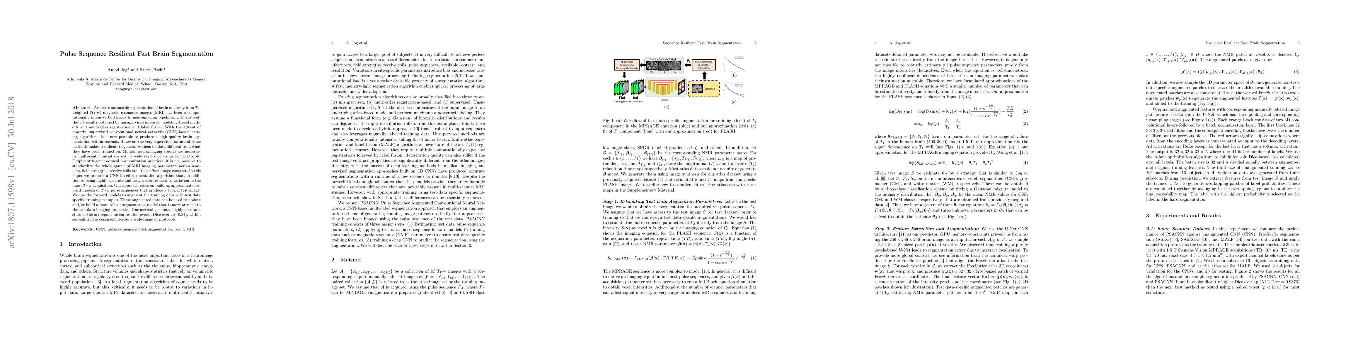 Accurate automatic segmentation of brain anatomy from $T_1$-weighted~($T_1$-w) magnetic resonance images~(MRI) has been a computationally intensive bottleneck in neuroimaging pipelines, with state-of-the-art results obtained by unsupervised intensity modeling-based methods and multi-atlas registration and label fusion. With the advent of powerful supervised convolutional neural networks~(CNN)-based learning algorithms, it is now possible to produce a high quality brain segmentation within seconds. However, the very supervised nature of these methods makes it difficult to generalize them on data different from what they have been trained on. Modern neuroimaging studies are necessarily multi-center initiatives with a wide variety of acquisition protocols. Despite stringent protocol harmonization practices, it is not possible to standardize the whole gamut of MRI imaging parameters across scanners, field strengths, receive coils etc., that affect image contrast. In this paper we propose a CNN-based segmentation algorithm that, in addition to being highly accurate and fast, is also resilient to variation in the input $T_1$-w acquisition. Our approach relies on building approximate forward models of $T_1$-w pulse sequences that produce a typical test image. We use the forward models to augment the training data with test data specific training examples. These augmented data can be used to update and/or build a more robust segmentation model that is more attuned to the test data imaging properties. Our method generates highly accurate, state-of-the-art segmentation results~(overall Dice overlap=0.94), within seconds and is consistent across a wide-range of protocols.