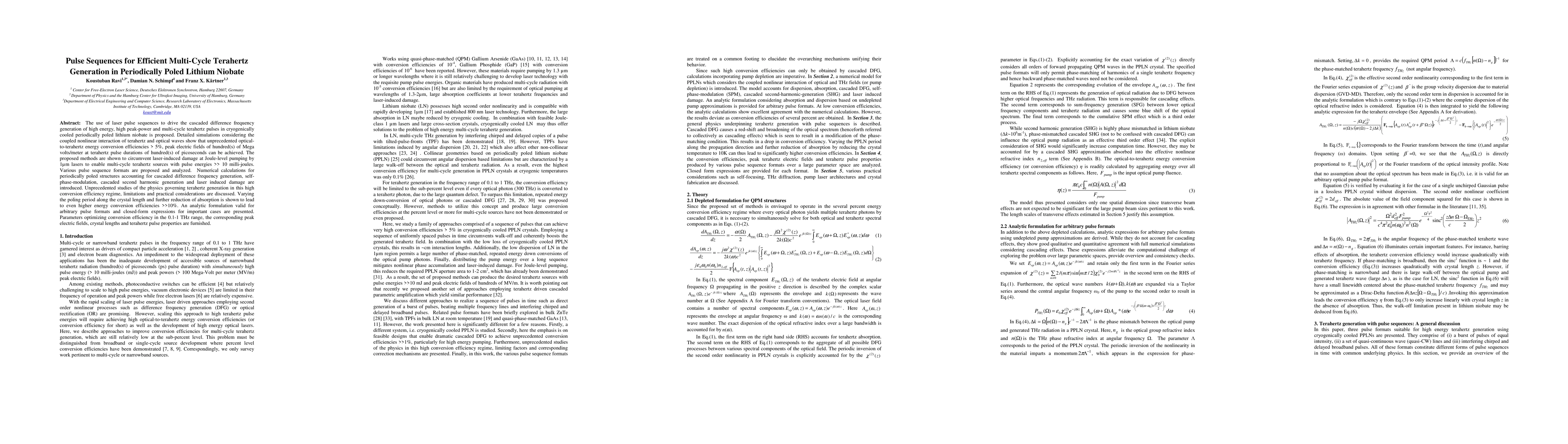 The paper proposes efficient multi-cycle terahertz generation in cryogenically cooled periodically poled lithium niobate using laser pulse sequences, achieving optical-to-terahertz energy conversion efficiencies exceeding 5% and peak electric fields of hundreds of Mega volts/meter. It discusses methods to prevent laser-induced damage while generating terahertz pulses with durations of hundreds of picoseconds and energies greater than 10 milli-joules.