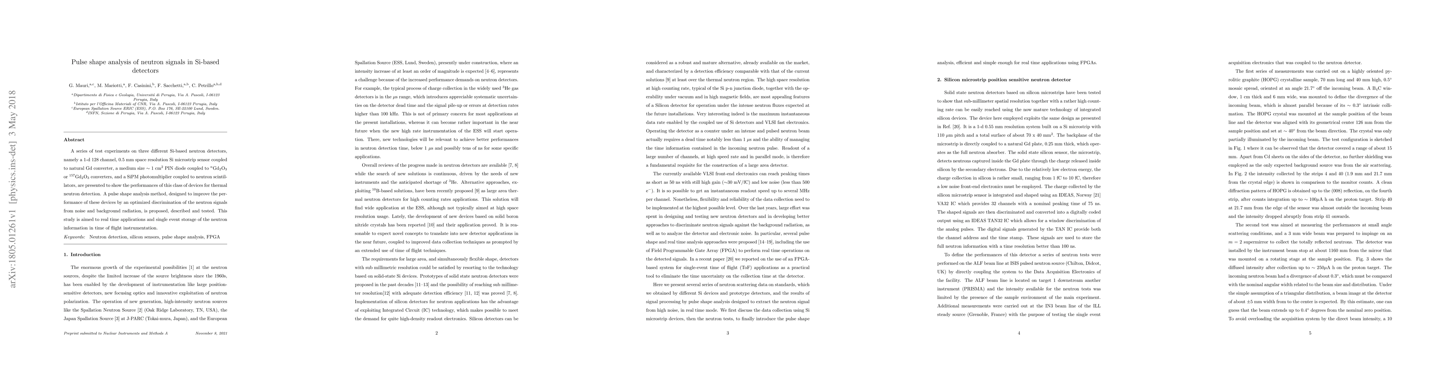 A series of test experiments on three different Si-based neutron detectors, namely a 1-d 128 channel, 0.5 mm space resolution Si microstrip sensor coupled to natural Gd converter, a medium size ? 1 cm2 PIN diode coupled to nGd2O3 or 157Gd2O3 converters, and a SiPM photomultiplier coupled to neutron scintillators, are presented to show the performances of this class of devices for thermal neutron detection. A pulse shape analysis method, designed to improve the performance of these devices by an optimized discrimination of the neutron signals from noise and background radiation, is proposed, described and tested. This study is aimed to real time applications and single event storage of the neutron information in time of flight instrumentation.