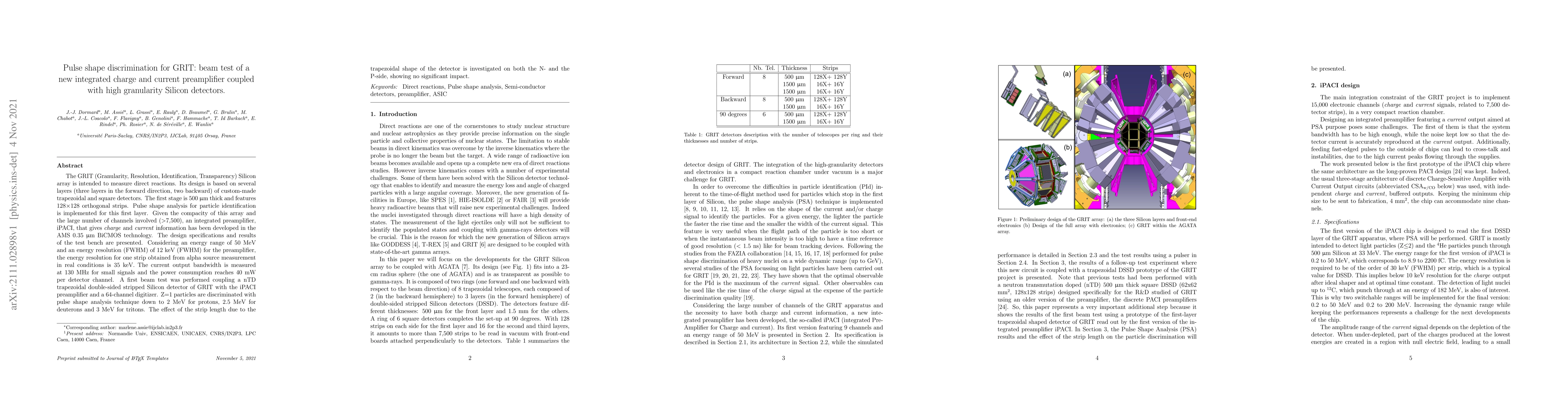 Researchers developed a new integrated charge and current preamplifier for the GRIT Silicon array, achieving an energy resolution of 35 keV and demonstrating pulse shape discrimination capabilities for Z=1 particles down to 2 MeV.