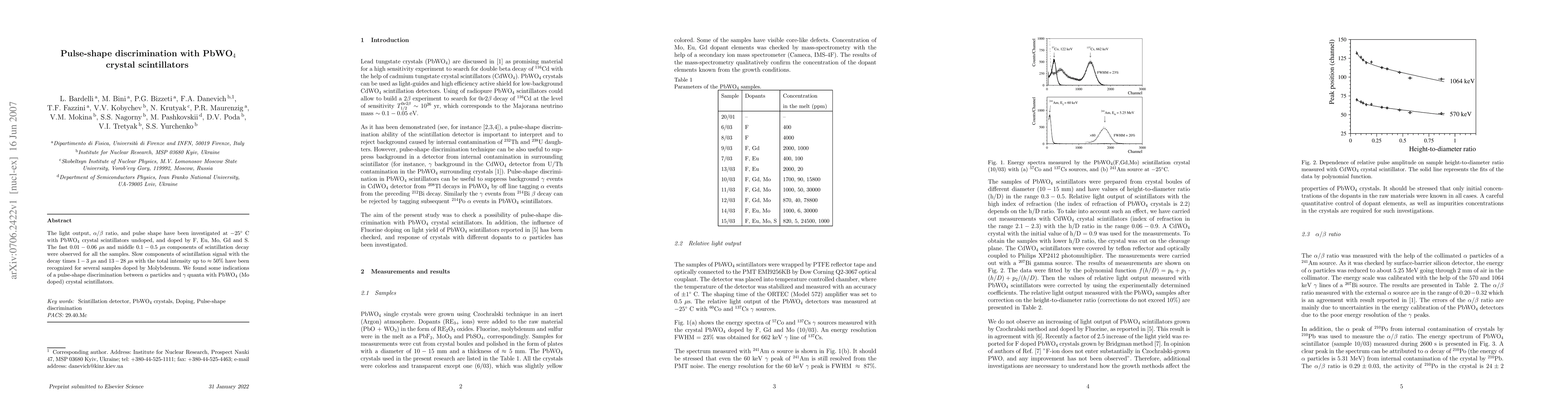This study investigates the light output and pulse shape discrimination in PbWO$_4$ crystal scintillators, both undoped and doped with various elements. It finds distinct scintillation decay components and indicates potential for pulse-shape discrimination between $\alpha$ particles and $\gamma$ quanta in Molybdenum-doped samples.