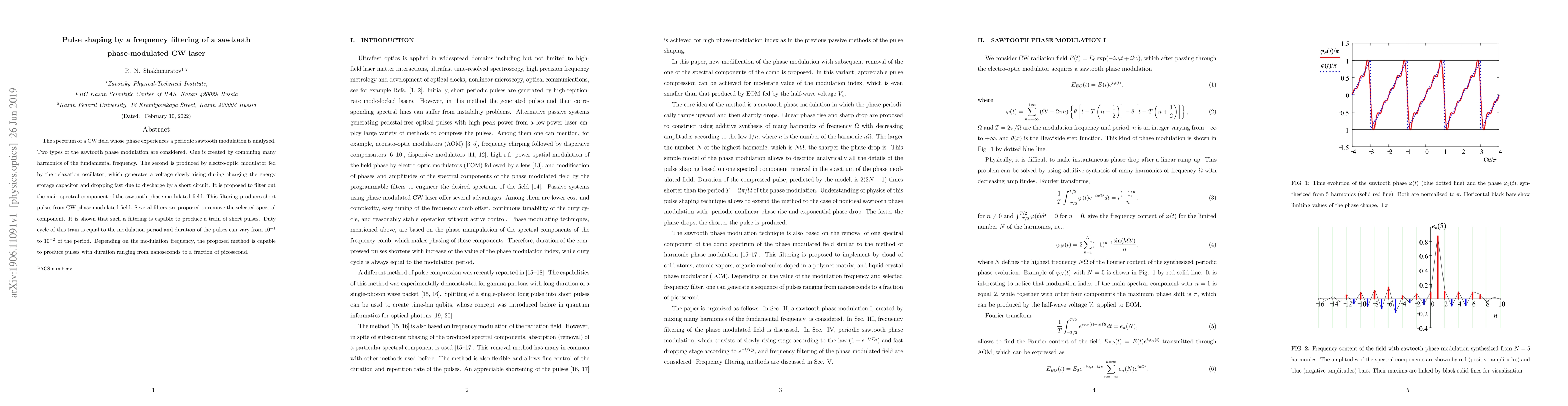 This paper analyzes the spectrum of a continuous wave (CW) laser with a sawtooth phase modulation, proposing methods to filter out the main spectral component to generate short pulses. Various filters are suggested to achieve this, resulting in pulse durations ranging from nanoseconds to fractions of picoseconds.