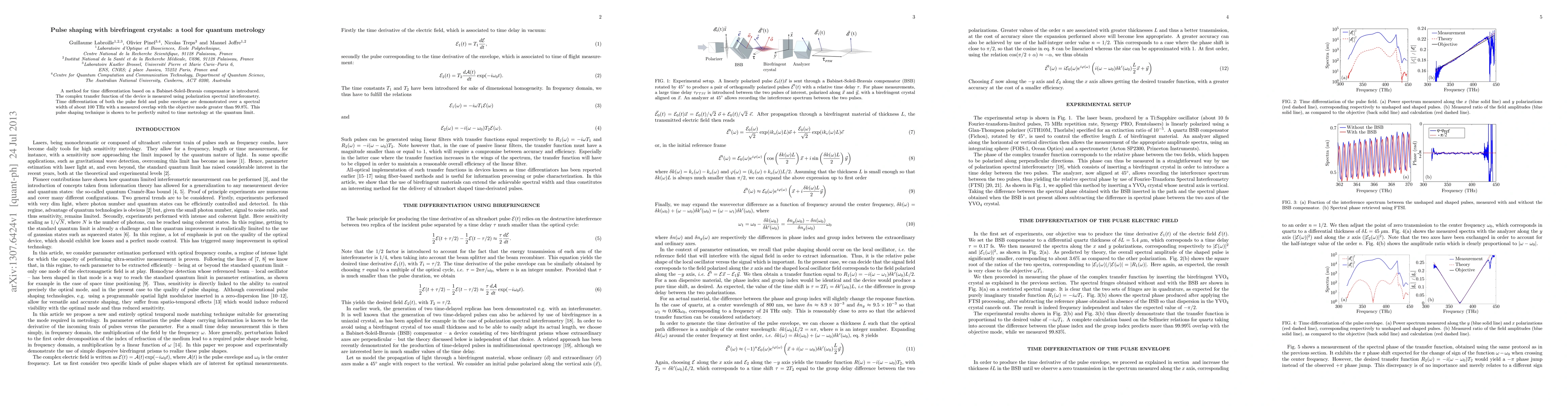 A method for time differentiation based on a Babinet-Soleil-Bravais compensator is introduced. The complex transfer function of the device is measured using polarization spectral interferometry. Time differentiation of both the pulse field and pulse envelope are demonstrated over a spectral width of about 100 THz with a measured overlap with the objective mode greater than 99.8%. This pulse shaping technique is shown to be perfectly suited to time metrology at the quantum limit.