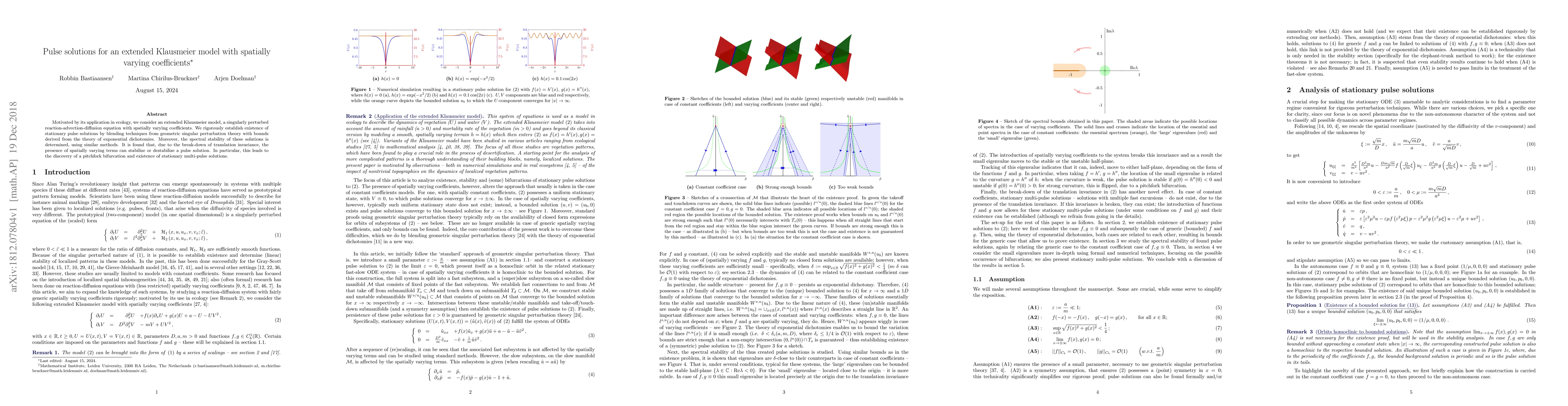 Motivated by its application in ecology, we consider an extended Klausmeier model, a singularly perturbed reaction-advection-diffusion equation with spatially varying coefficients. We rigorously establish existence of stationary pulse solutions by blending techniques from geometric singular perturbation theory with bounds derived from the theory of exponential dichotomies. Moreover, the spectral stability of these solutions is determined, using similar methods. It is found that, due to the break-down of translation invariance, the presence of spatially varying terms can stabilize or destabilize a pulse solution. In particular, this leads to the discovery of a pitchfork bifurcation and existence of stationary multi-pulse solutions.