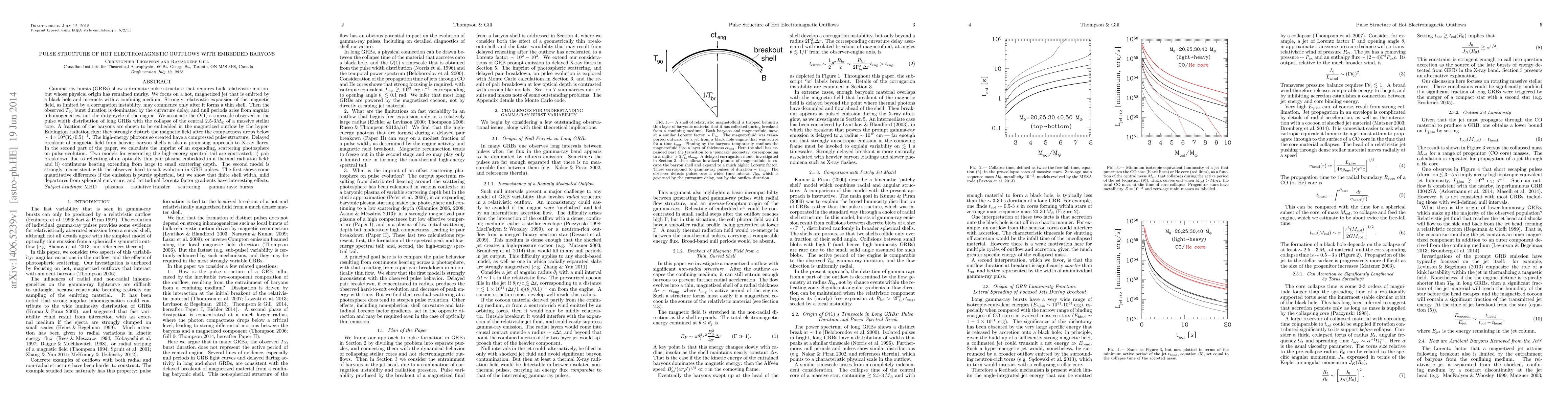 Gamma-ray bursts (GRBs) show a dramatic pulse structure that requires bulk relativistic motion, but whose physical origin has remained murky. We focus on a hot, magnetized jet that is emitted by a black hole and interacts with a confining medium. Strongly relativistic expansion of the magnetic field, as limited by a corrugation instability, may commence only after it forms a thin shell. Then the observed $T_{90}$ burst duration is dominated by the curvature delay, and null periods arise from angular inhomogeneities, not the duty cycle of the engine. We associate the $O(1)$ s timescale observed in the pulse width distribution of long GRBs with the collapse of the central 2.5-3$M_\odot$ of a massive stellar core. A fraction of the baryons are shown to be embedded in the magnetized outflow by the hyper-Eddington radiation flux; they strongly disturb the magnetic field after the compactness drops below $\sim 4\times 10^3(Y_e/0.5)^{-1}$. The high-energy photons so created have a compressed pulse structure. Delayed breakout of magnetic field from heavier baryon shells is also a promising approach to X-ray flares. In the second part of the paper, we calculate the imprint of an expanding, scattering photosphere on pulse evolution. Two models for generating the high-energy spectral tail are contrasted: i) pair breakdown due to reheating of an optically thin pair plasma embedded in a thermal radiation field; and ii) continuous heating extending from large to small scattering depth. The second model is strongly inconsistent with the observed hard-to-soft evolution in GRB pulses. The first shows some quantitative differences if the emission is purely spherical, but we show that finite shell width, mild departures from spherical curvature, and latitudinal Lorentz factor gradients have interesting effects.