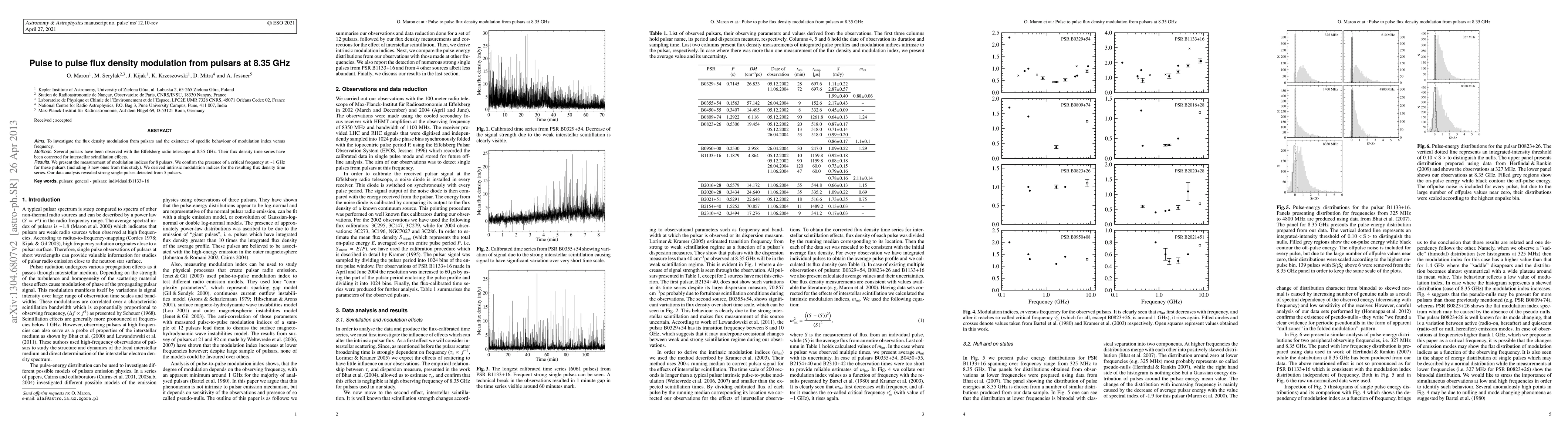 Aims. To investigate the flux density modulation from pulsars and the existence of specific behaviour of modulation index versus frequency. Methods. Several pulsars have been observed with the Effelsberg radio telescope at 8.35 GHz. Their flux density time series have been corrected for interstellar scintillation effects. Results. We present the measurement of modulation indices for 8 pulsars. We confirm the presence of a critical frequency at ~1 GHz for these pulsars (including 3 new ones from this study). We derived intrinsic modulation indices for the resulting flux density time series. Our data analysis revealed strong single pulses detected from 5 pulsars.