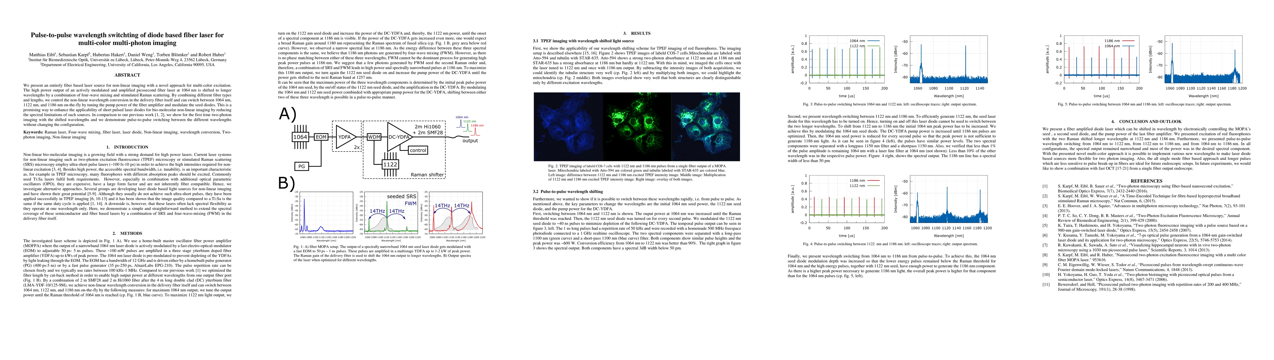 This paper introduces a fiber-based laser source for multi-color excitation in non-linear imaging, utilizing four-wave mixing and stimulated Raman scattering to shift wavelengths from 1064 nm to 1122 nm and 1186 nm. The system enables pulse-to-pulse wavelength switching without configuration changes, enhancing the use of short pulsed laser diodes for bio-molecular imaging.