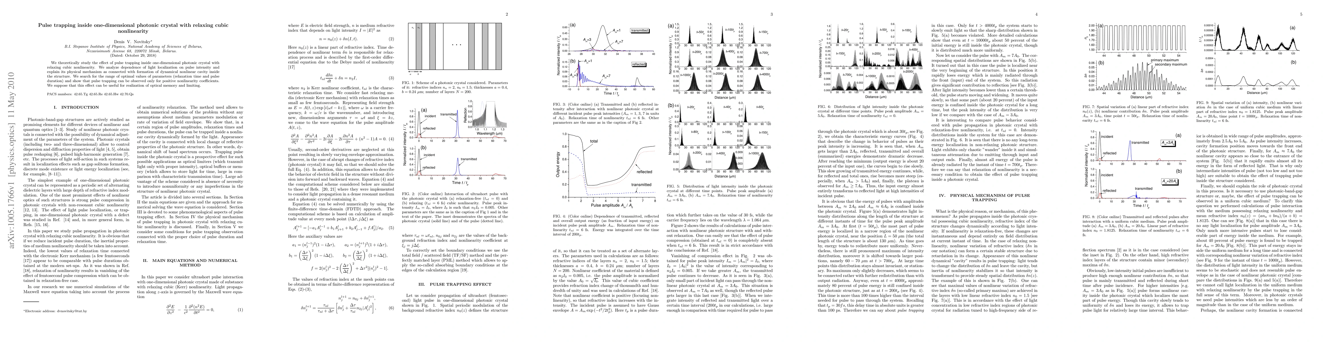 We theoretically study the effect of pulse trapping inside one-dimensional photonic crystal with relaxing cubic nonlinearity. We analyze dependence of light localization on pulse intensity and explain its physical mechanism as connected with formation of dynamical nonlinear cavity inside the structure. We search for the range of optimal values of parameters (relaxation time and pulse duration) and show that pulse trapping can be observed only for positive nonlinearity coefficients. We suppose that this effect can be useful for realization of optical memory and limiting.