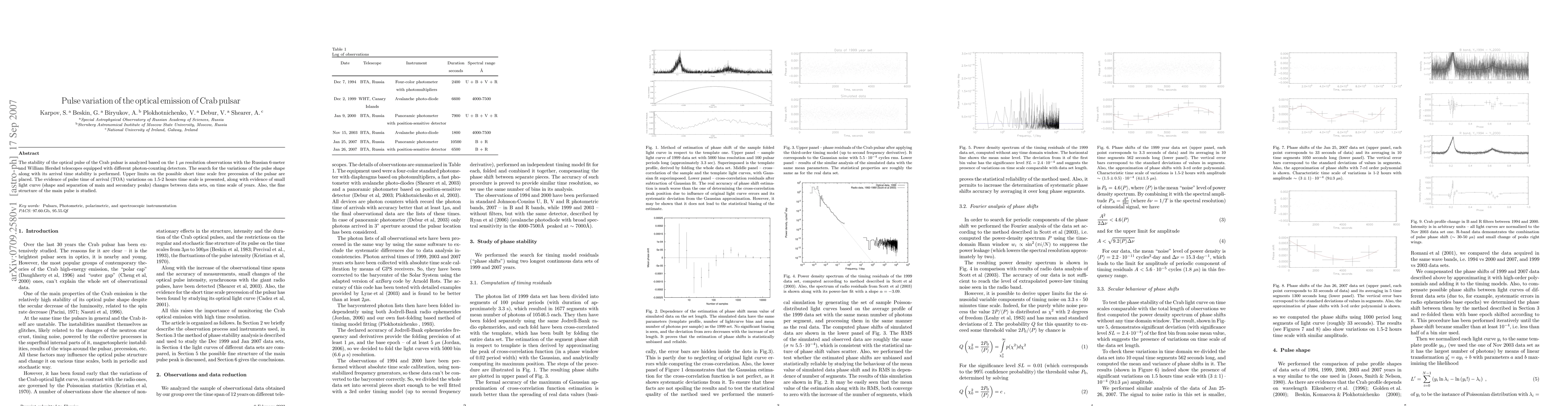 The research analyzes the Crab pulsar's optical pulse stability using high-resolution observations from the Russian 6-meter and William Herschel telescopes. It reports upper limits on short-scale pulsar precession, evidence of TOA variations on 1.5-2 hour scale, and light curve changes over years. The fine structure of the main pulse is also studied.