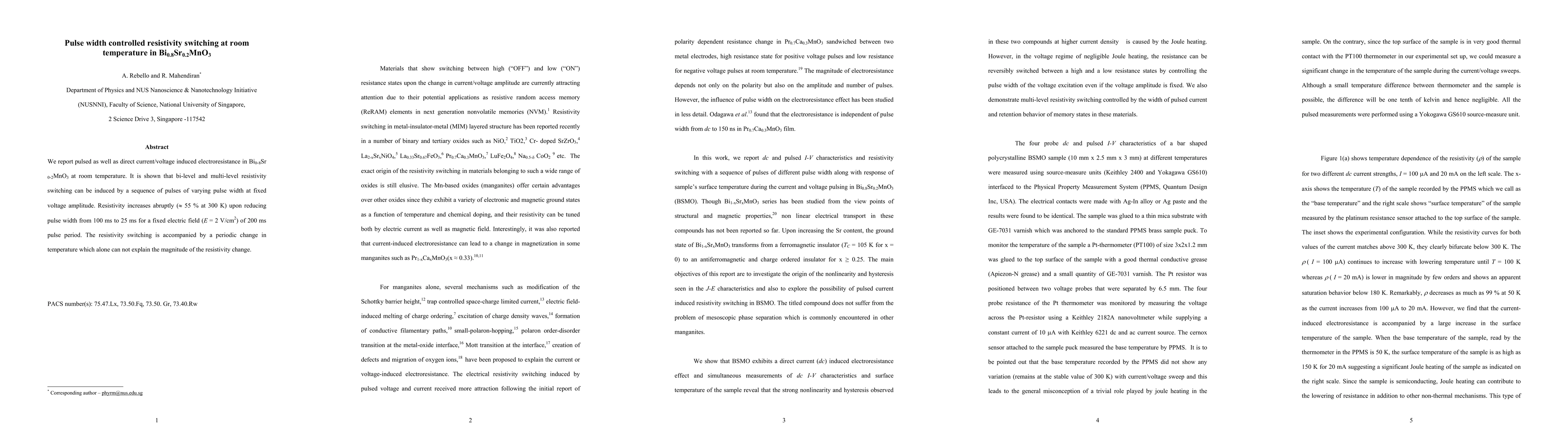 We report pulsed as well as direct current/voltage induced electroresistance in Bi0.8Sr0.2MnO3 at room temperature. It is shown that bi-level and multi-level resistivity switching can be induced by a sequence of pulses of varying pulse width at fixed voltage amplitude. Resistivity increases abruptly (= 55 % at 300 K) upon reducing pulse width from 100 ms to 25 ms for a fixed electric field (E = 2 V/cm2) of 200 ms pulse period. The resistivity switching is accompanied by a periodic change in temperature which alone can not explain the magnitude of the resistivity change.