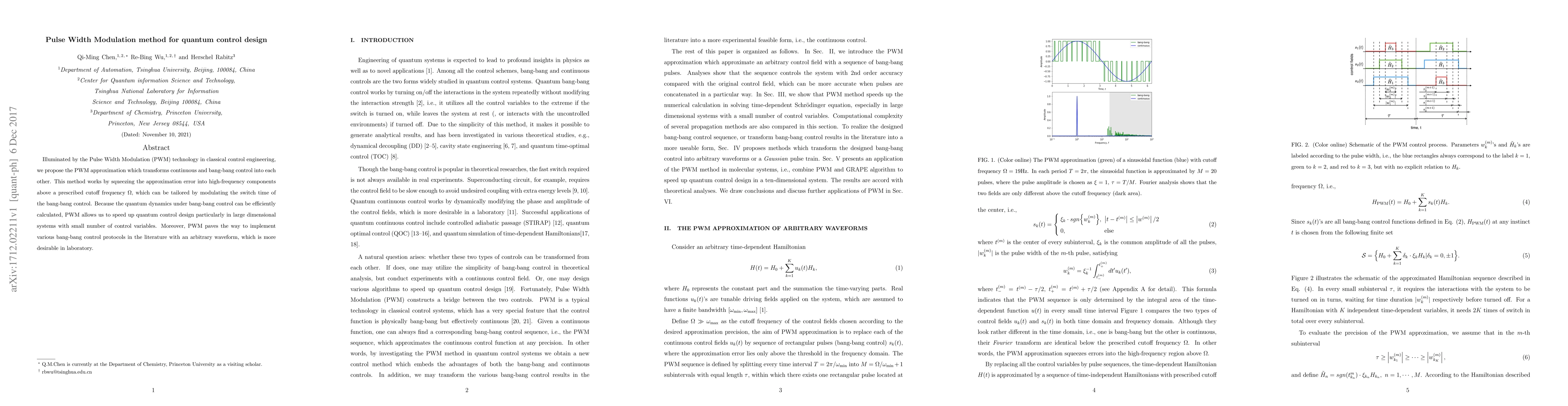 This paper proposes a Pulse Width Modulation (PWM) method for quantum control design, transforming continuous and bang-bang controls by squeezing errors into high-frequency components. This approach speeds up quantum control design in large systems and allows for the implementation of various bang-bang protocols with arbitrary waveforms.