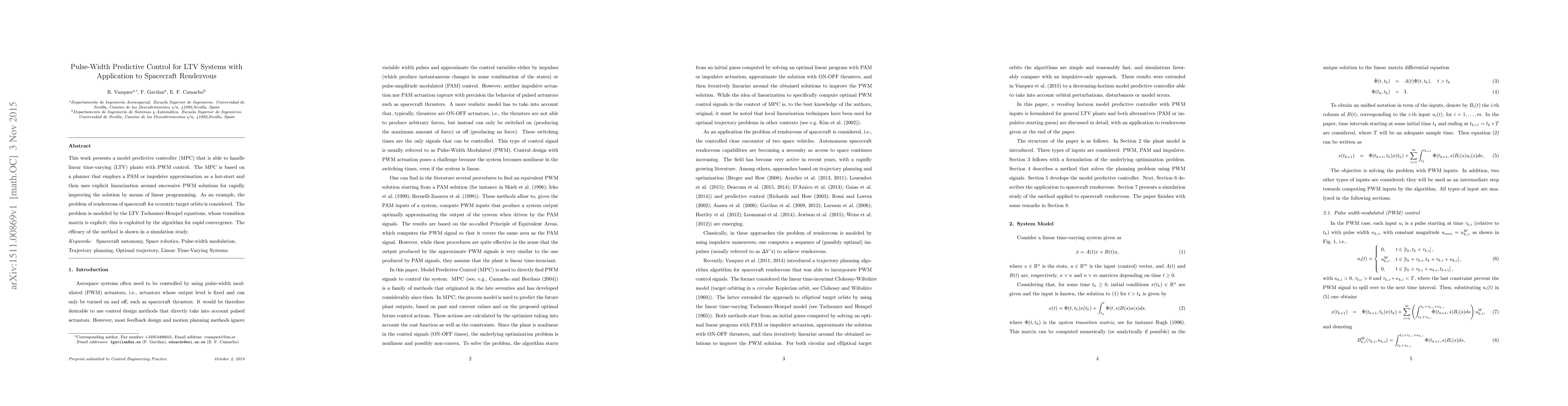 This paper introduces a pulse-width predictive controller for linear time-varying systems, employing a planner with impulsive approximation and linearization for rapid convergence. The method is demonstrated through spacecraft rendezvous simulations using the LTV Tschauner-Hempel equations.