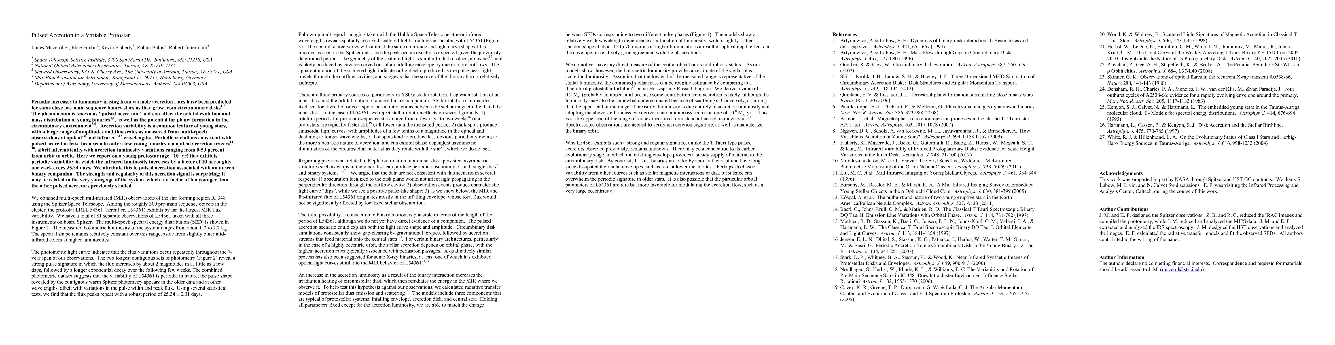 This paper reports on a young protostar showing periodic luminosity increases, attributed to pulsed accretion from a binary companion, with infrared luminosity rising tenfold every 25.34 days, suggesting a unique and possibly age-related accretion pattern in very young stellar systems.
