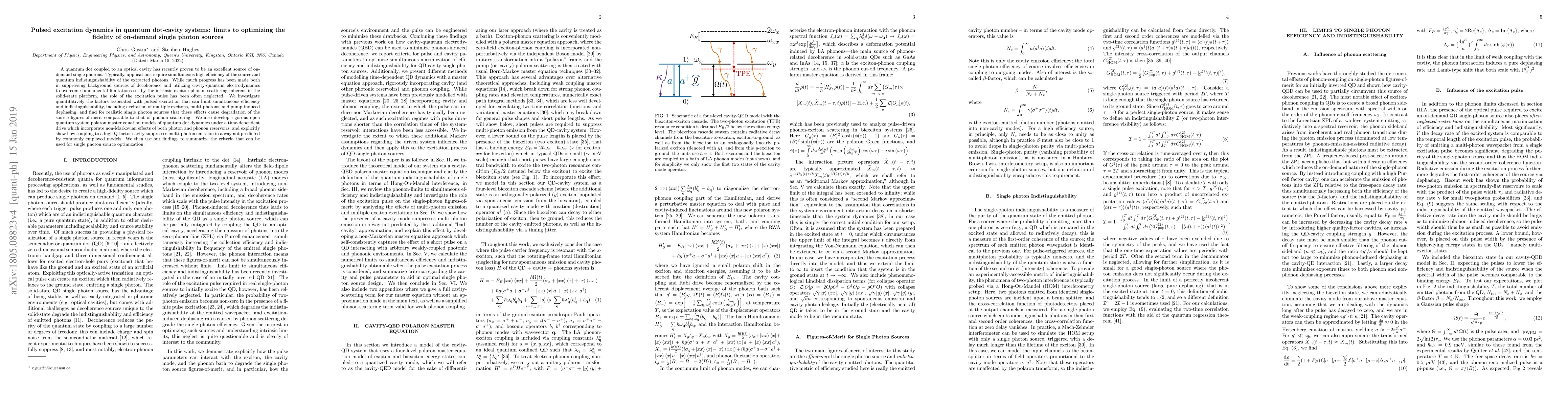 A quantum dot coupled to an optical cavity has recently proven to be an excellent source of on-demand single photons. Typically, applications require simultaneous high efficiency of the source and quantum indistinguishability of the extracted photons. While much progress has been made both in suppressing background sources of decoherence and utilizing cavity-quantum electrodynamics to overcome fundamental limitations set by the intrinsic exciton-phonon scattering inherent in the solid-state platform, the role of the excitation pulse has been often neglected. We investigate quantitatively the factors associated with pulsed excitation that can limit simultaneous efficiency and indistinguishability, including excitation of multiple excitons, multi-photons, and pump-induced dephasing, and find for realistic single photon sources that these effects cause degradation of the source figures-of-merit comparable to that of phonon scattering. We also develop rigorous open quantum system polaron master equation models of quantum dot dynamics under a time-dependent drive which incorporate non-Markovian effects of both photon and phonon reservoirs, and explicitly show how coupling to a high Q-factor cavity suppresses multi-photon emission in a way not predicted by commonly employed models. We then use our findings to summarize the criteria that can be used for single photon source optimization.