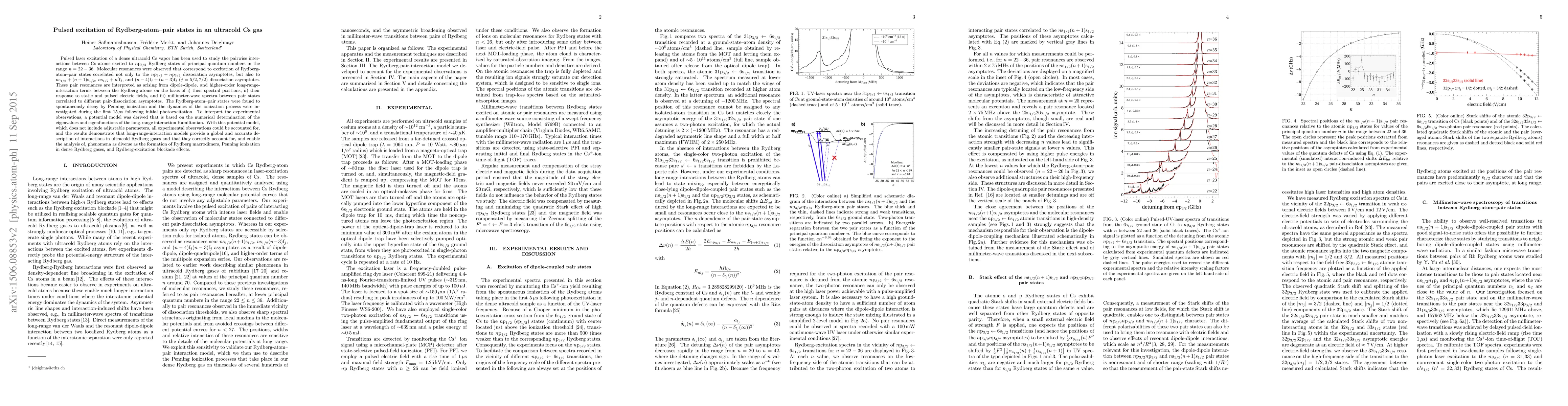 This paper investigates the pairwise interactions between ultracold Cs atoms in Rydberg states using pulsed laser excitation, revealing molecular resonances corresponding to various dissociation asymptotes. The study demonstrates that long-range interaction models accurately describe the dynamics, including Penning ionization, and provide insights into Rydberg-atom phenomena.