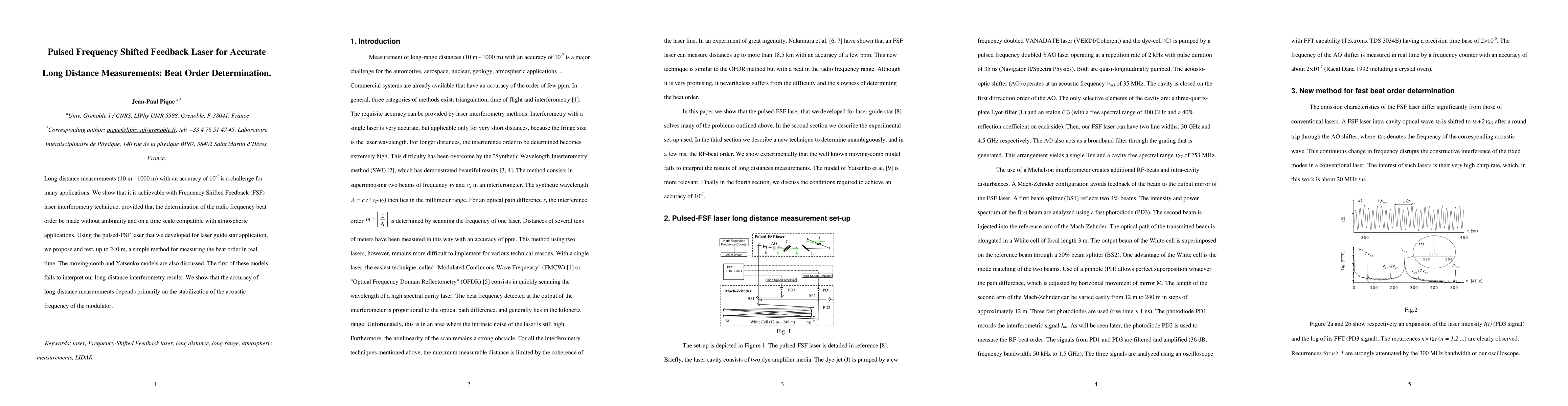 This paper proposes a pulsed Frequency Shifted Feedback (FSF) laser interferometry technique for accurate long-distance measurements up to 1000 meters with 10^-7 precision. It introduces a real-time beat order determination method, tested up to 240 meters, and discusses the inadequacies of the moving-comb model, emphasizing the importance of acoustic frequency stabilization.