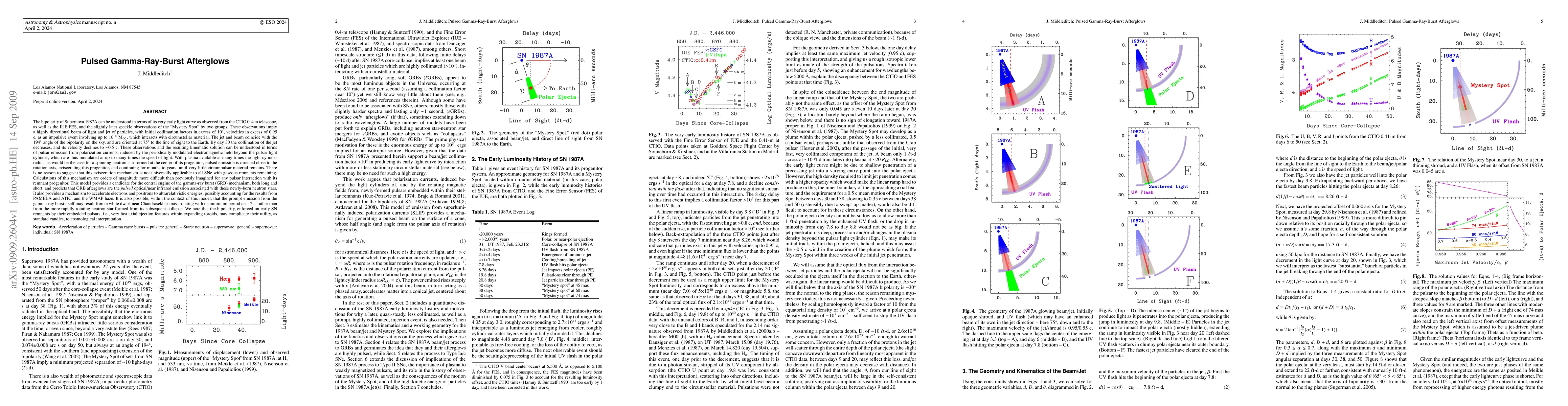 The bipolarity of Supernova 1987A can be understood in terms of its very early light curve as observed from the CTIO 0.4-m telescope, as well as the IUE FES, and the slightly later speckle observations of the "Mystery Spot" by two groups. These observations imply a highly directional beam of light and jet of particles, with initial collimation factors in excess of 10,000, velocities in excess of 0.95 c, as an impulsive event involving up to 0.00001 solar masses, which interacts with circumstellar material. The jet and beam coincide with the 194 degree angle of the bipolarity on the sky, and are oriented at 75 degrees to the line of sight to the Earth. By day 30 the collimation of the jet decreases, and its velocity declines to ~0.5 c. These observations and the resulting kinematic solution can be understood in terms of pulsar emission from polarization currents, induced by the periodically modulated electromagnetic field beyond the pulsar light cylinder, which are thus modulated at up to many times the speed of light. With plasma available at many times the light cylinder radius, as would be the case for a spinning neutron star formed at the center of its progenitor, pulsed emission is directed close to the rotation axis, eviscerating this progenitor, and continuing for months to years, until very little circumpulsar material remains. This model provides a candidate for the central engine of the gamma-ray burst (GRB) mechanism, both long and short, and predicts that GRB afterglows are the_pulsed_ optical/near infrared emission associated with these newly-born neutron stars.