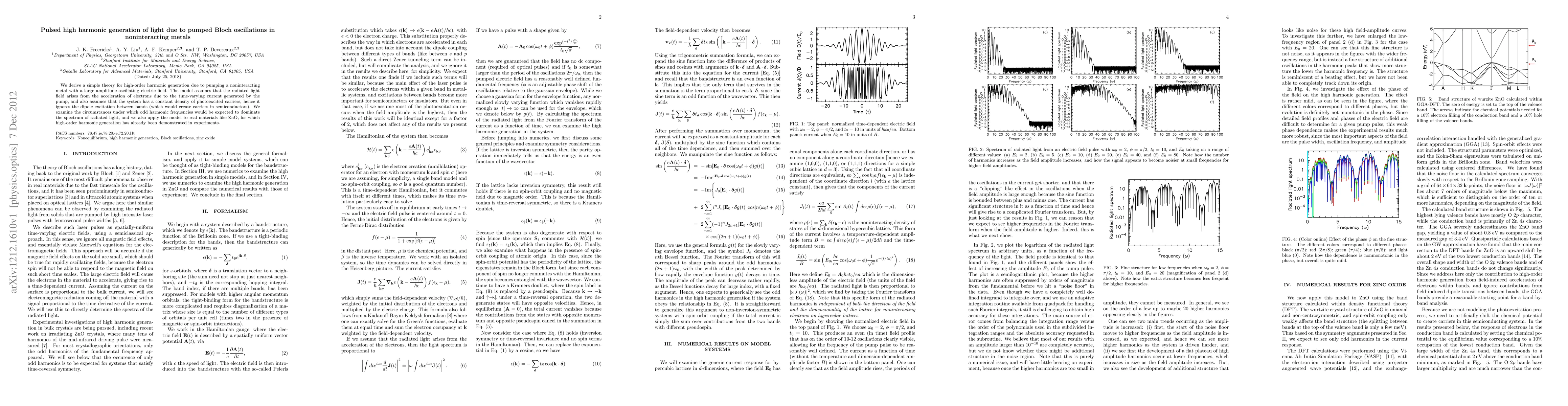 This paper develops a theoretical framework for high-order harmonic generation in noninteracting metals driven by large amplitude oscillating electric fields, attributing the phenomenon to the acceleration of electrons due to pump-induced Bloch oscillations. The model predicts dominance of odd harmonics and is applied to materials like ZnO, aligning with experimental observations.